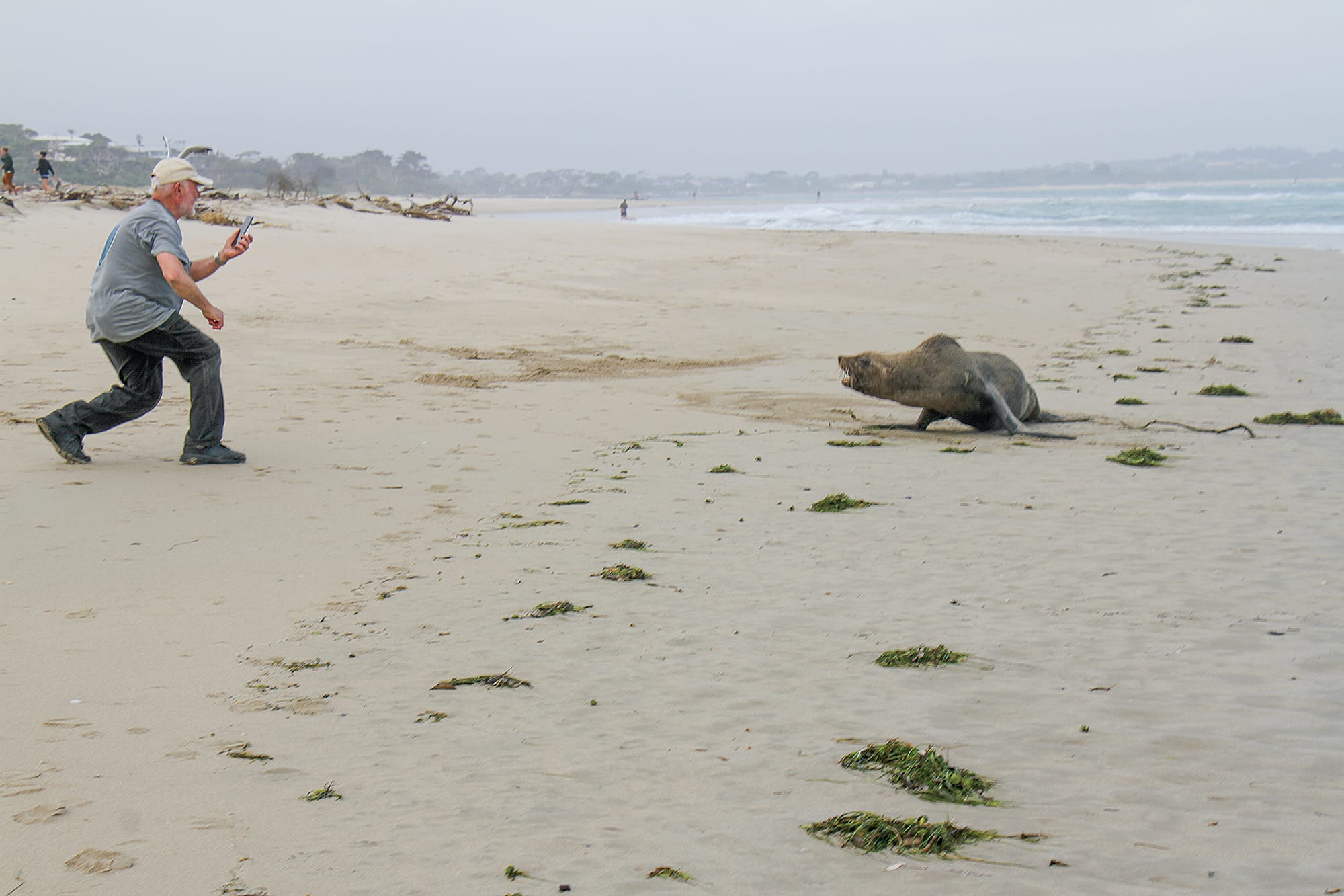 One tourist taking close-up photos of Sammy found fur seals can move very quickly.