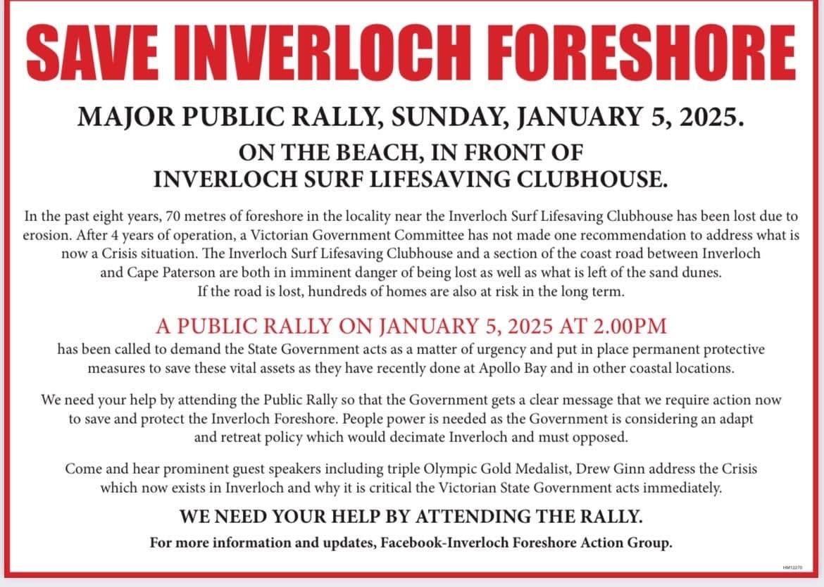 For more information about the rally at the Inverloch surf beach on January 5 go to the Inverloch Foreshore Action Group on Facebook facebook.com/groups/3555316291433437.