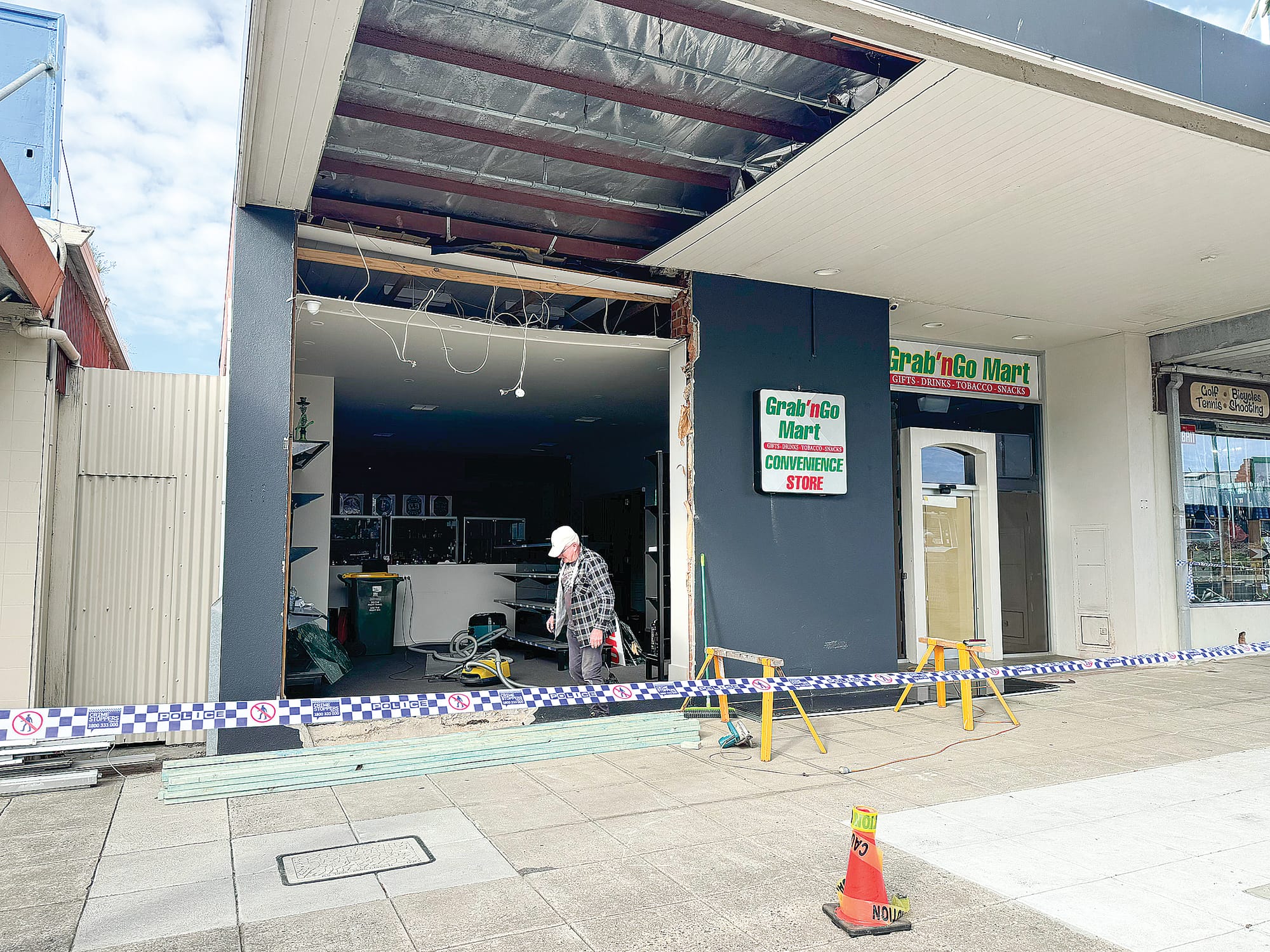 According to Criminal Investigation Unit police, the stolen car was driven into a front window of the new Grab’n’Go Mart, which wasn’t due to open until September 1, confirming that nothing had been stolen.