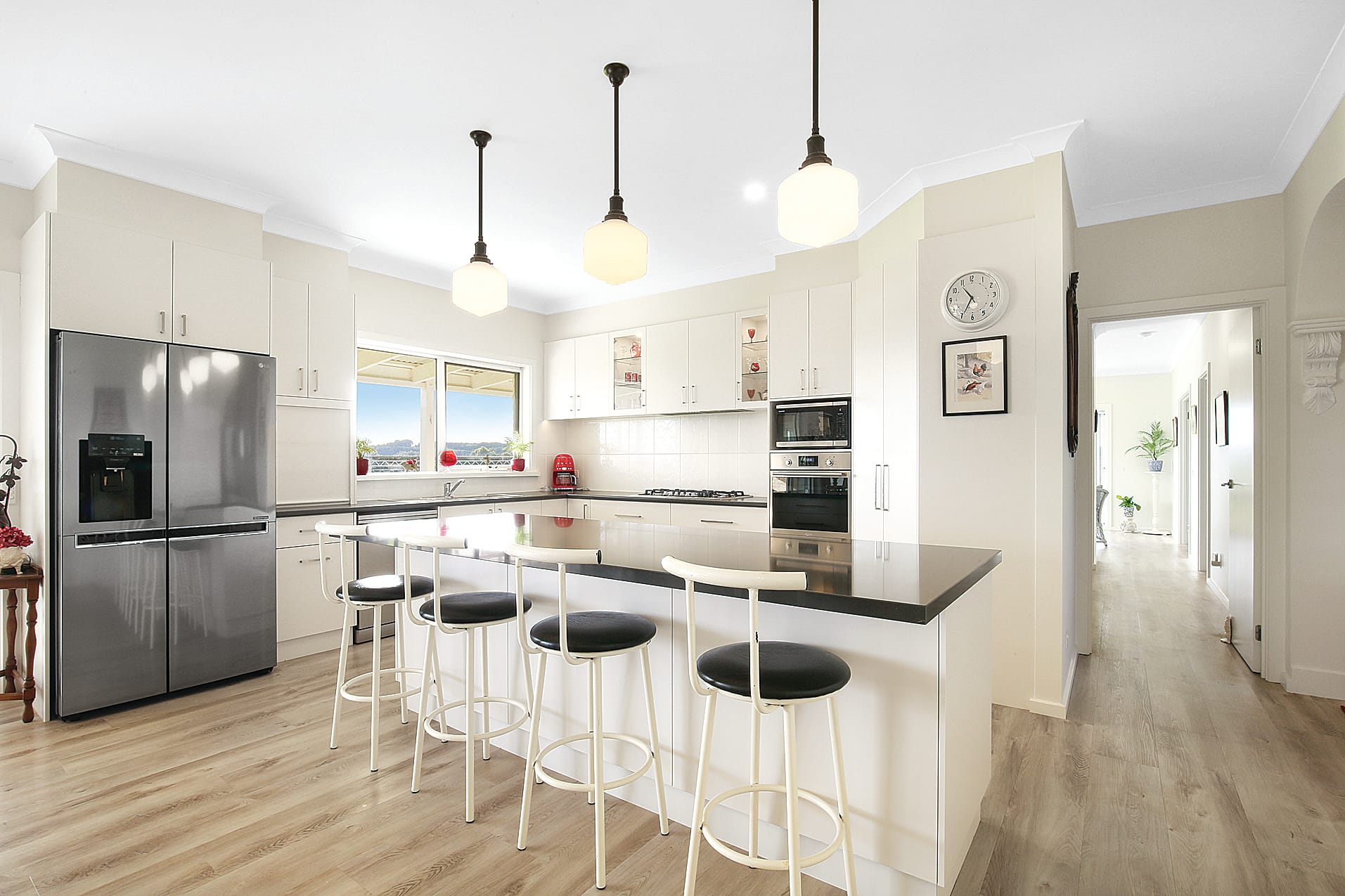 The kitchen is a culinary delight, featuring Caesar Stone benchtops, an electric wall oven, gas cooktop, dishwasher, and pantry.