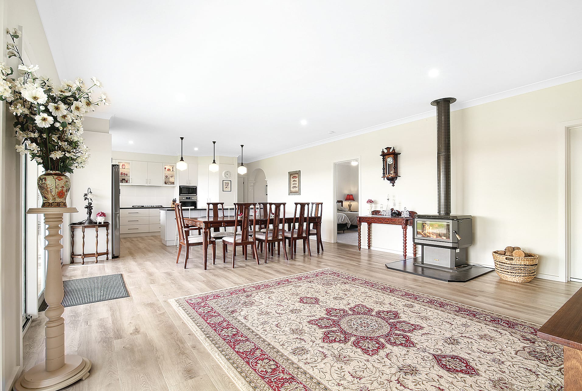 The heart of the home is a north-facing open plan kitchen, dining, and living area, where you’ll be captivated by stunning vistas of the surrounding countryside. Imagine cosying up by the wood fire during chilly evenings or enjoying the comfort of the reverse cycle air-conditioner.