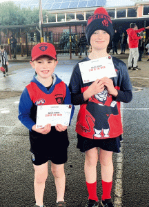 Melbourne Demons fans, Annabelle (8) and Eddie (5) Fallu, both won “Star of the Week” awards at AusKick in Korumburra on Saturday, May 15.