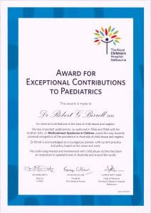 A tribute to Dr Robert Birrell OAM on the occasion of a significant award from the Royal Children’s Hospital, by Alumni President, Dr Kevin Collins on April 27, 2017 provides some insignt: