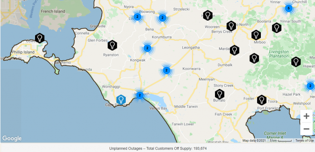 Locations without power include Inverloch (2200 customers), Wonthaggi, Leongatha, parts of Korumburra (194), Cowes (905), Leongatha South, Middle Tarwin, Outtrim, Pound Creek, Koonwarra, Grantville, Ryanston, Glen Alvie, Kernot, Woolamai, Silverleaves (566), Buffalo, Fish Creek, Foster, Toora, Poowong (348), Bena… in fact it might be easier to mention the towns with power.