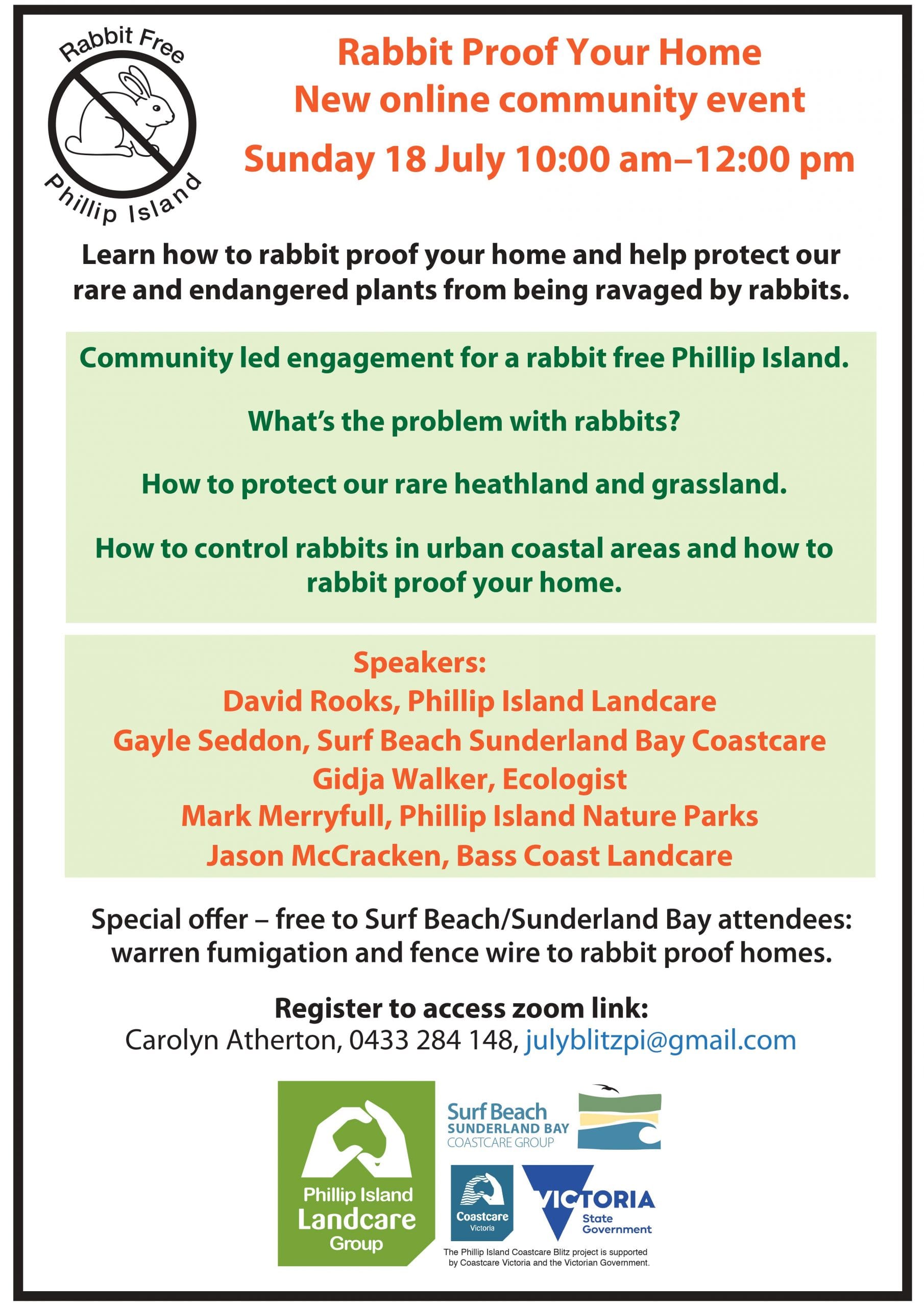Residents and landowners of Surf Beach and Sunderland Bay can learn how to rabbit proof their homes and protect rare and endangered plants at the Rabbit Free Phillip Island online community conversation on Sunday, July 18 at Surf Beach.
