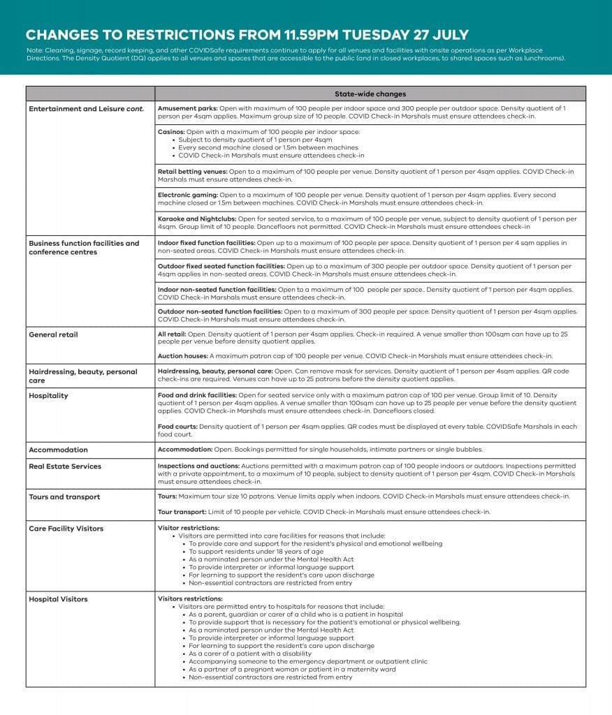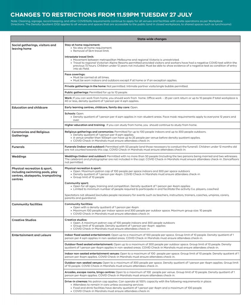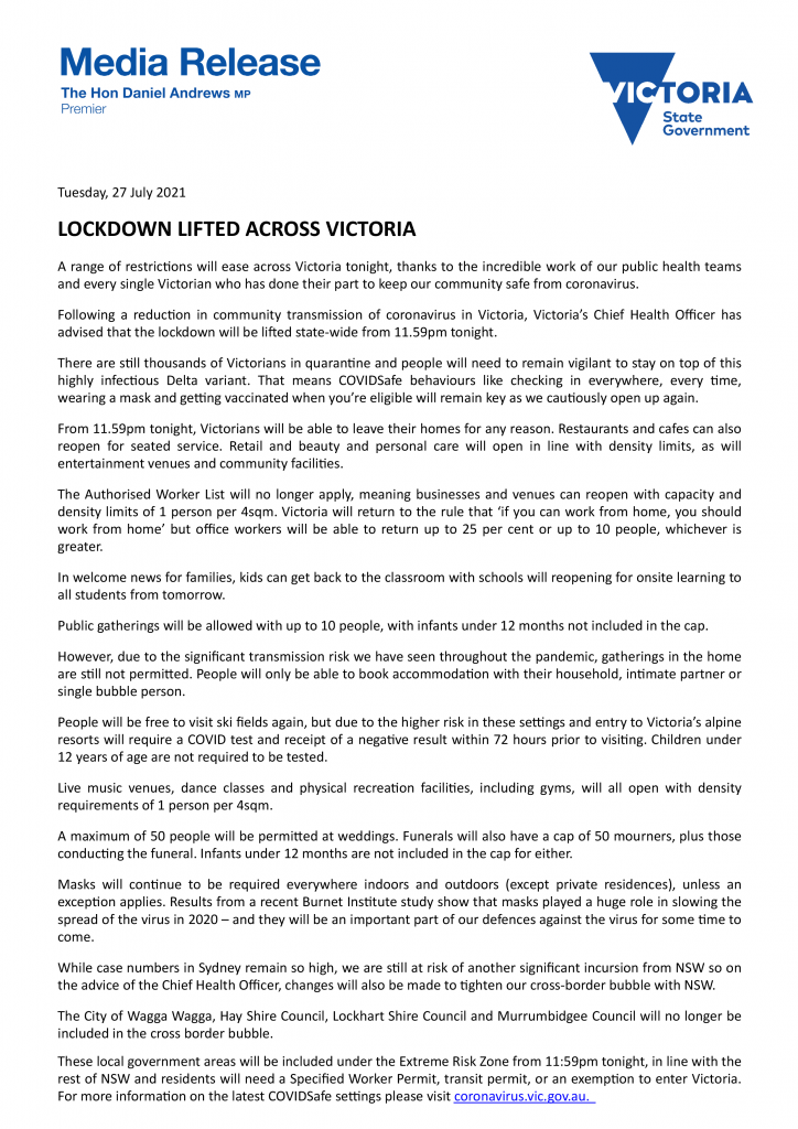 PREMIER Daniel Andrews this morning announced an easing of restrictions from 11.59pm tonight (Tuesday, July 27), including the scrapping of the five reasons to leave home and 5km rule.