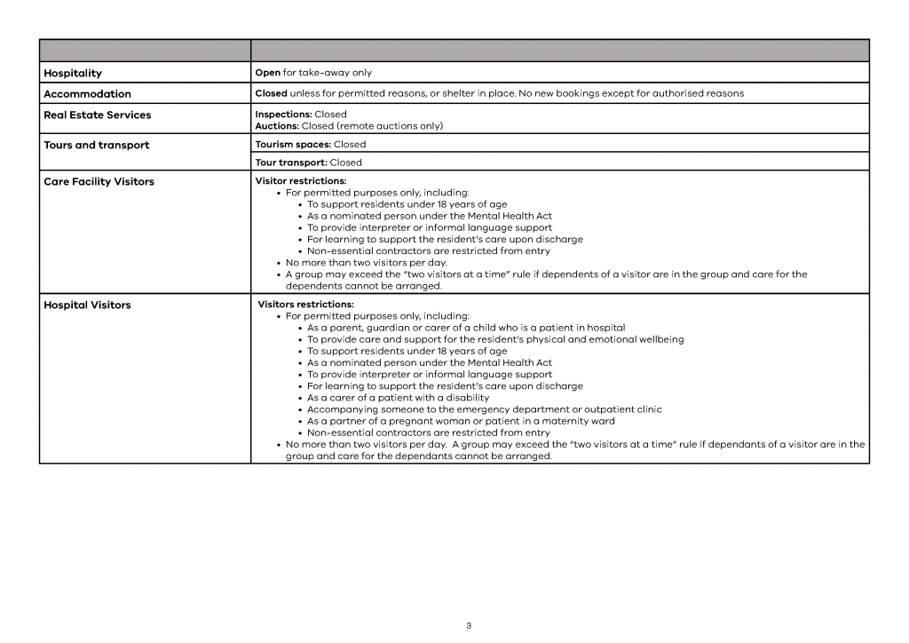 Private gatherings are not permitted except for an intimate partner or nominated person visits. Public gatherings are not permitted. Exercise is limited to two people.