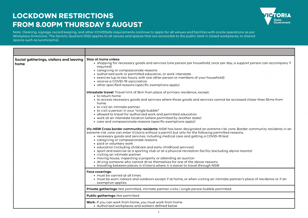 Due to the COVID-19 cases reported in the last 24 hours – suspected to be the highly infectious Delta variant – Victoria will enter a state-wide lockdown for seven days from 8:00pm tonight, Thursday 5 August.