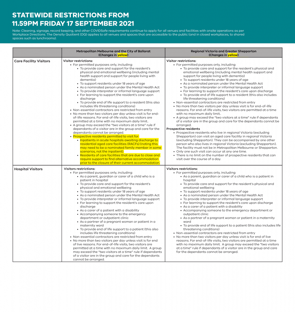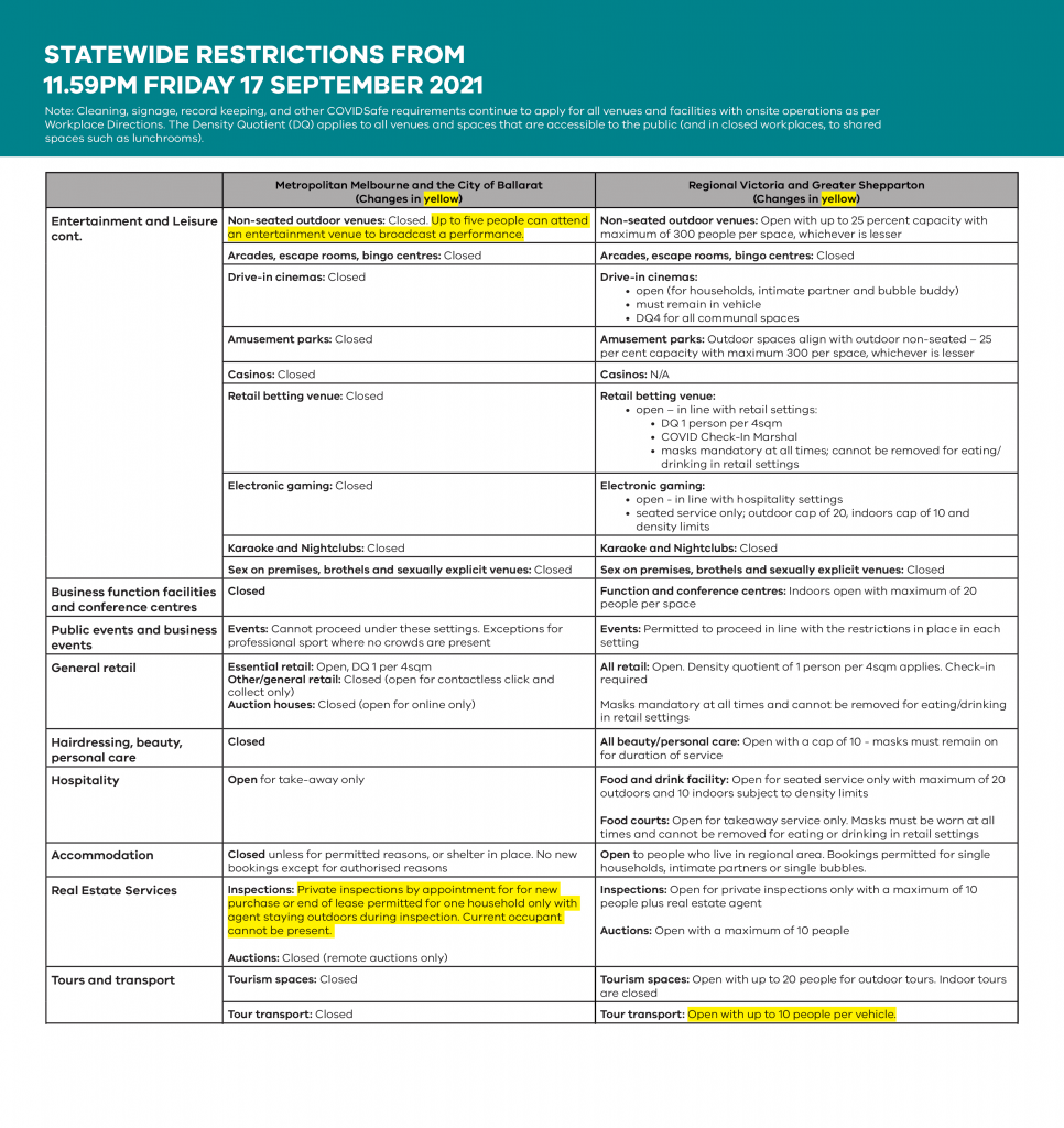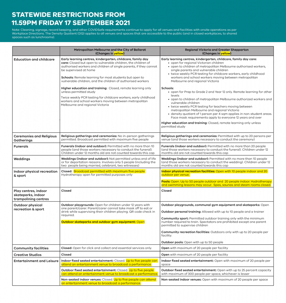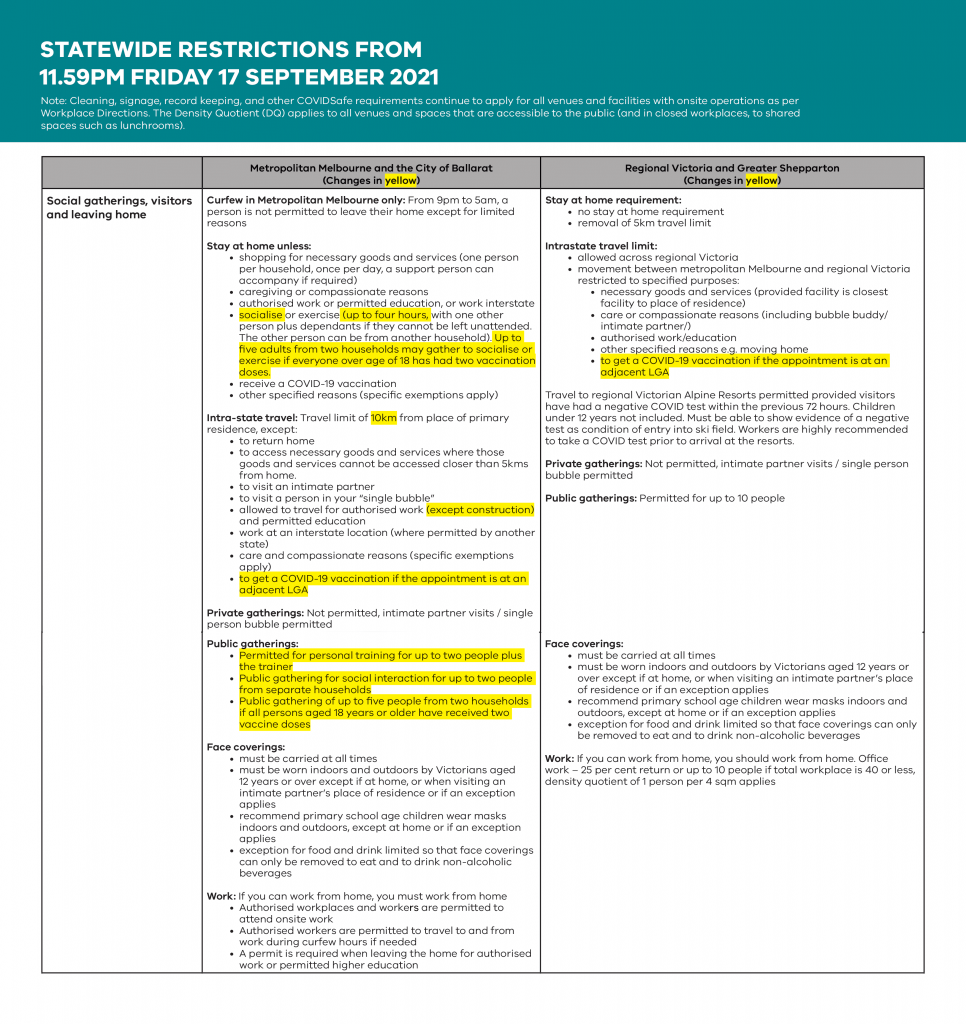 See the Premier's full statement below, followed by the table of restriction changes from 11.59pm this Friday, September 17, for Greater Melbourne and regional Victoria.