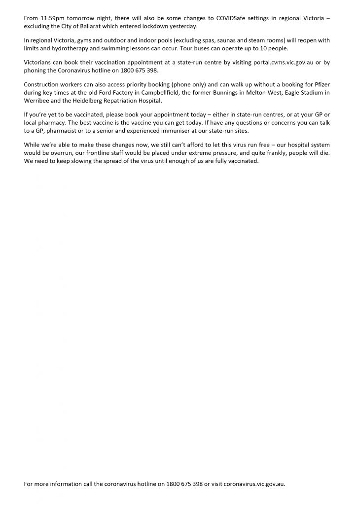 PREMIER Daniel Andrews today announced a minor easing of restrictions in Greater Melbourne, to take effect from 11.59pm this Friday, while also giving the green light for indoor pools and gyms to reopen in regional Victoria.