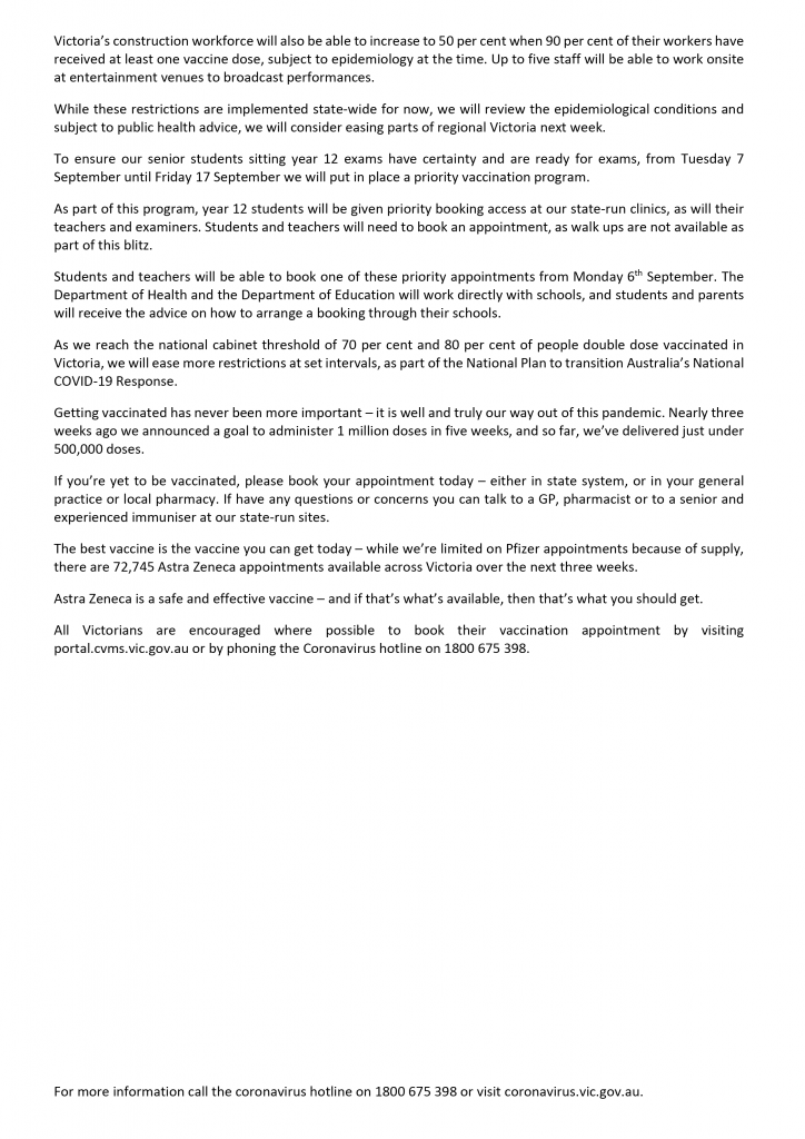 However, the Premier confirmed there would be a further easing of restrictions once 70 per cent of eligible Victorians have received one dose of a COVID-19 vaccine.