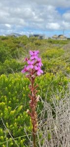 Where once this area would have been covered by a waving ocean of these long-stem plants, in pink flower at the moment, only those parts where the cages keep the rabbits out, are the Triggerplants returning, and with them some glorious native orchids and other over-grazed native plant species.