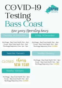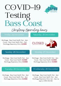 - Bass Coast: The Wonthaggi Bass Coast Health drive-through testing centre will be open every day except Christmas Day and New Years Day. Cowes drive-through will be open every day expect Christmas Day, Boxing Day, December 27 and New Years Day. Wonthaggi Respiratory Clinic will be open on Wednesday, December 29, Thursday, December 30 but they will be closed on all other days; December 24, 25, 26, 27, 28 & 31 and January 1, 2, 3.