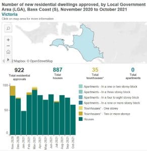 The latest data from the Australian Bureau of Statistics (ABS) has revealed that the number of new residential building approvals in Bass Coast, from November 2020 to October 2021 hit a 930 in total with 895 in houses and 35 townhouses.