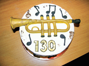 When AGM formalities were out of the way and the party began, attendees enjoyed an amazing cake artistically created by Rachel Michael, with 130 and a gold cornet on top, and musical notes around the sides.