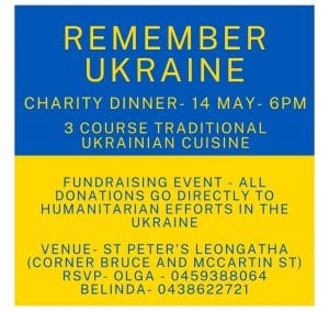 CHARITY DINNER RSVP: Olga 0459388064, Belinda 0438622721. SOUTH GIPPSLAND locals are encouraged to enjoy traditional Ukrainian cuisine at a special dinner in Leongatha on Saturday May 14, helping people displaced by the current conflict in Ukraine...