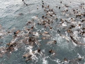 “This is incredible, it’s amazing,” they said as a seething, boiling mass of young seals crowded around the ‘Kasey Lee’.