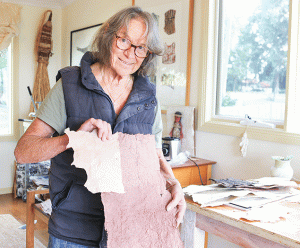 Meg demonstrated her papermaking technique for the Sentinel-Times, using a mould and deckle she built consisting of a wooden frame and fly wire.