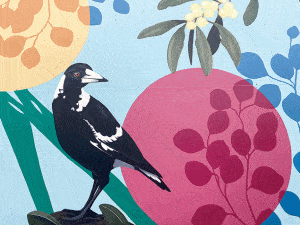Coastal banksias, a blue wren and a magpie are some aspects of nature featured in the vibrant artworks.