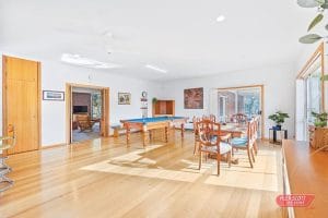 This light filled area is the engine room of the home with both formal and informal dining, polished hardwood timber floors and room for a big pool table.