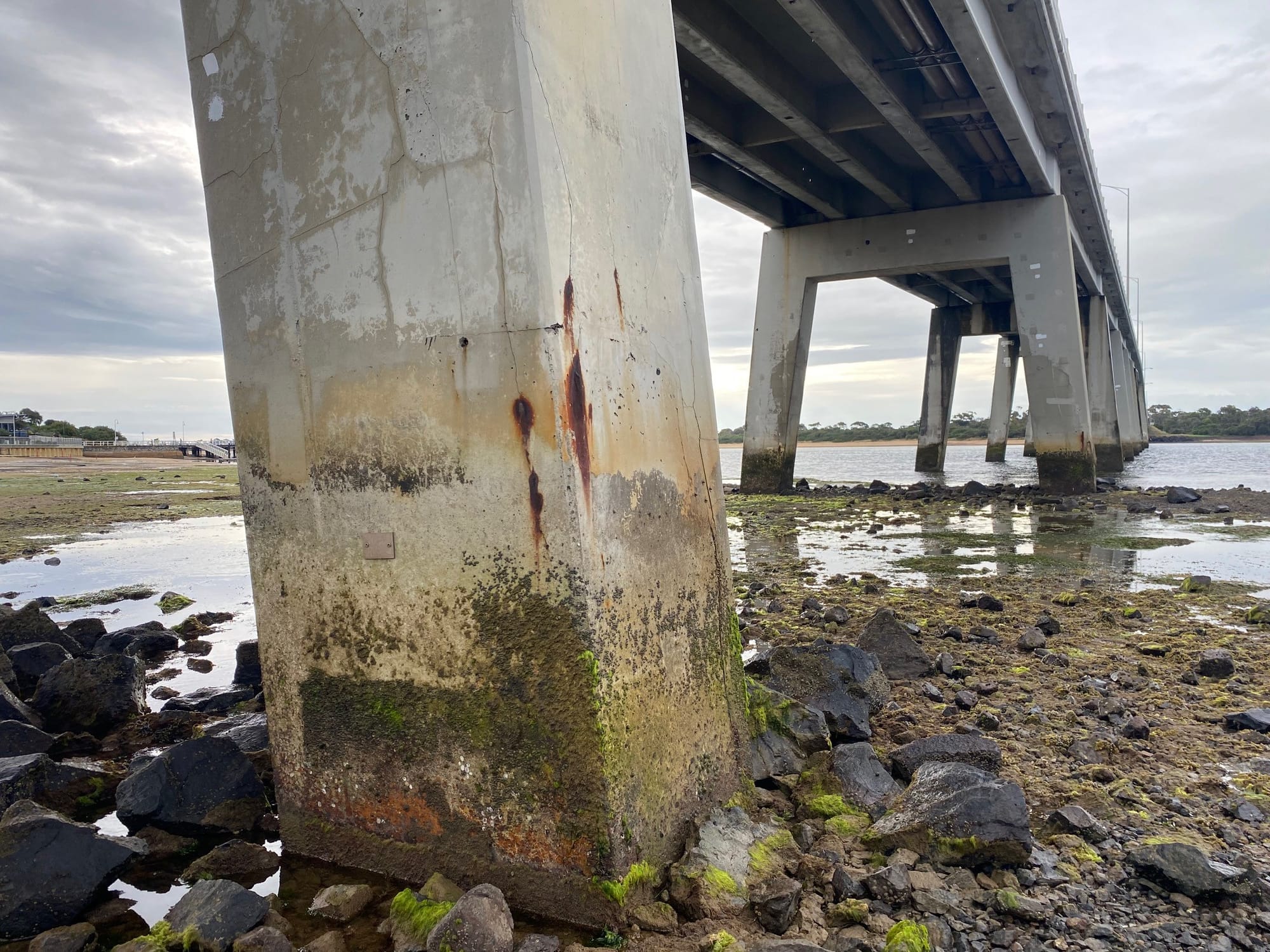 Normally, covering the steel structure of a bridge with concrete will reduce the rate of corrosion of the steel, even in a harsh coastal setting, to a very low, even negligible level.
