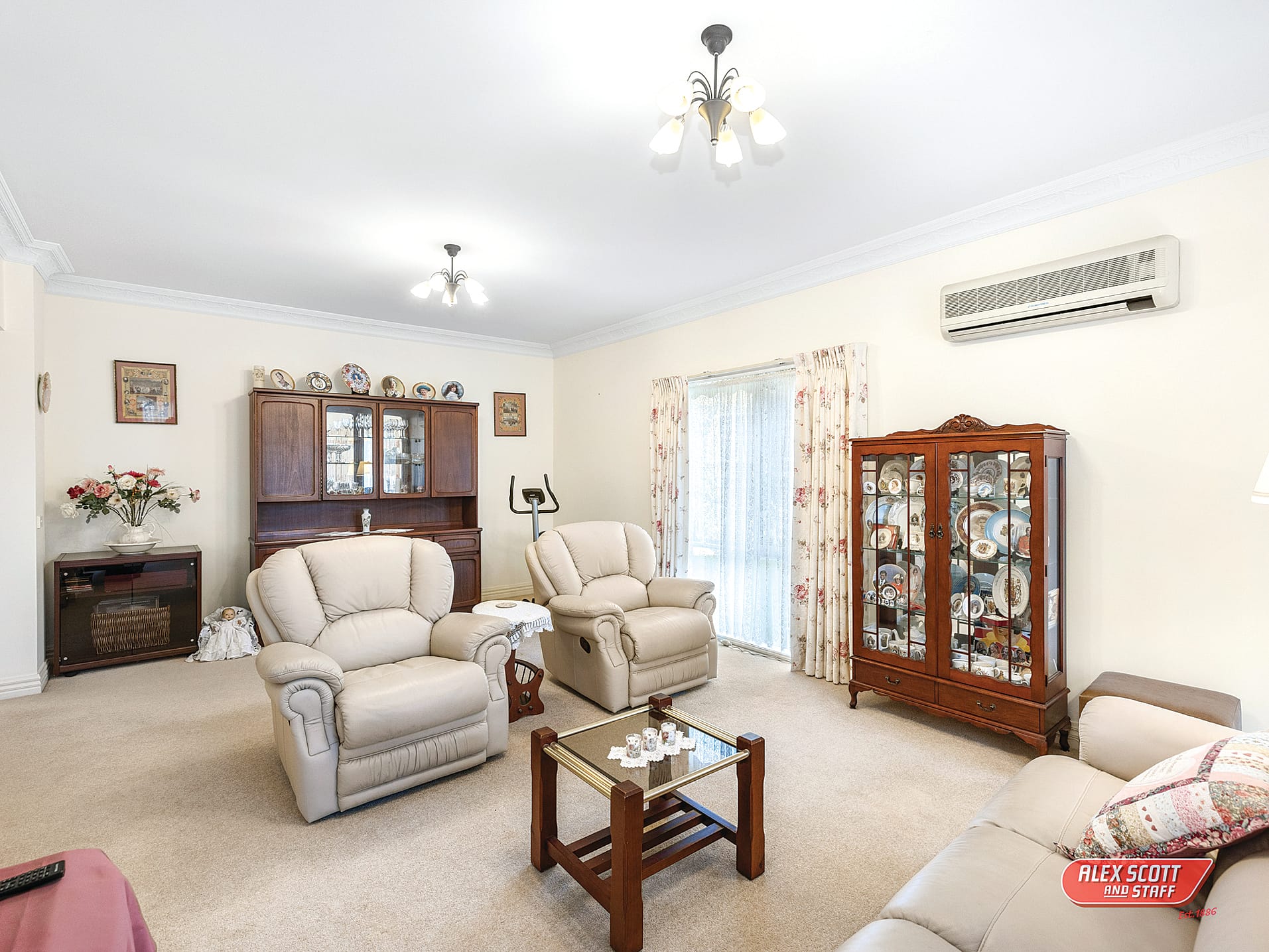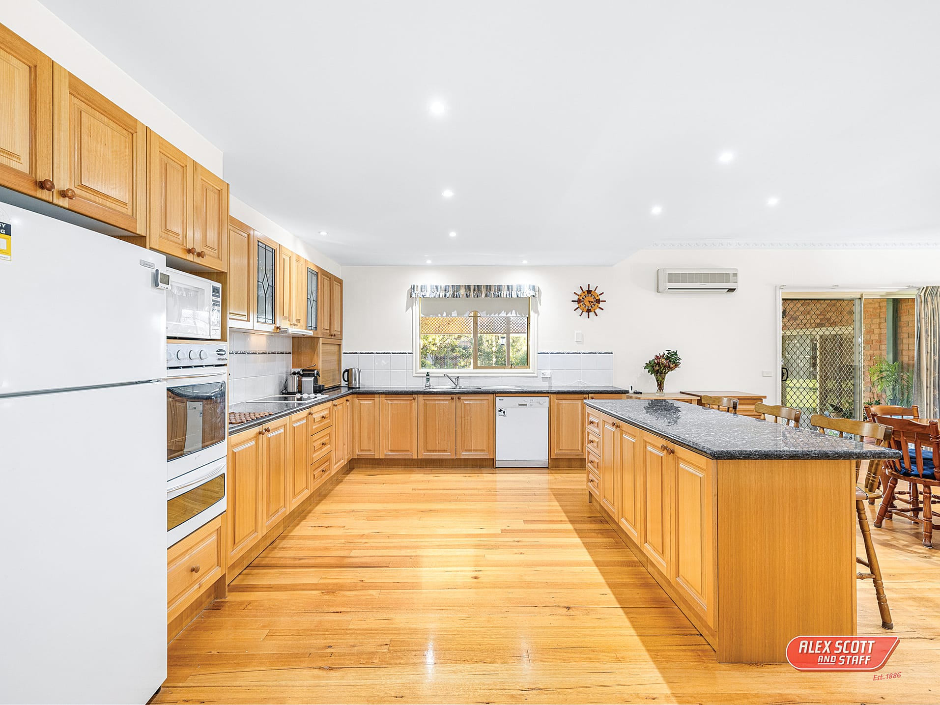 The heart of the home is a huge, light-filled country-style kitchen boasting beautiful Australian hardwood polished floors and a cosy slow combustion wood fire, creating an inviting atmosphere for cooking and gathering. In addition to the main living space, you’ll find a formal lounge and a versatile third living area/family room, ensuring ample space for relaxation and entertainment. Comfort is guaranteed year-round with split-system heating and cooling.