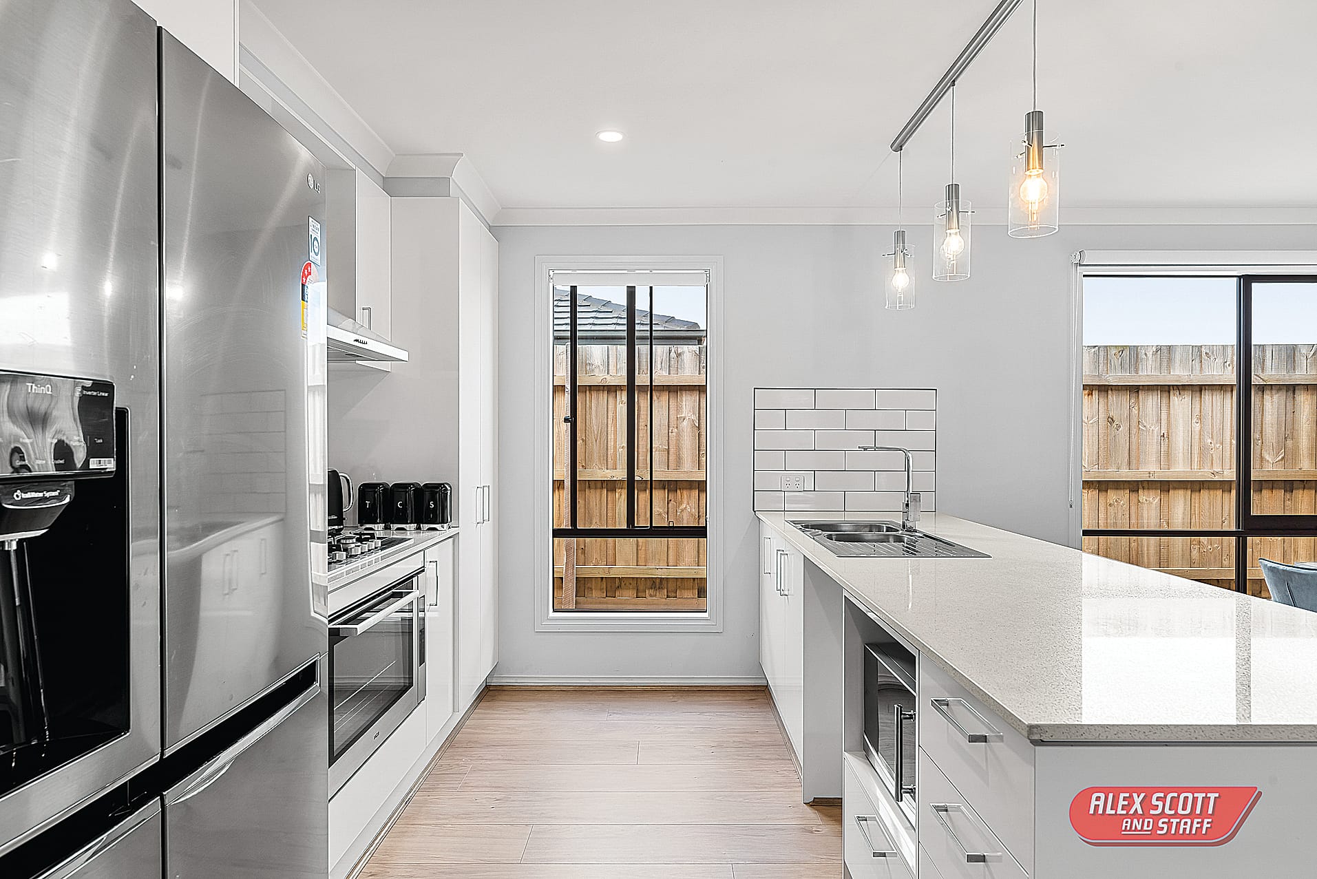 On arrival at this address you will notice the appeal of this two year old home, with its landscaped gardens, exposed aggregate concrete driveway, leading into a rendered double car garage and footpath up to the front portico of the house. upon entry you walk through the wide hallway leading to the master bedroom, complete with ceiling fan, walk thru robe and ensuite. next is the first of the living areas leading to the other two bedrooms, both fitted with ceiling fans and built in robes.