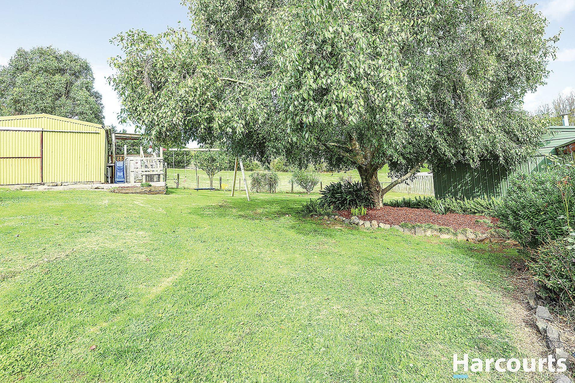 • Backyard oasis featuring a playground and two sheds with water tanks.