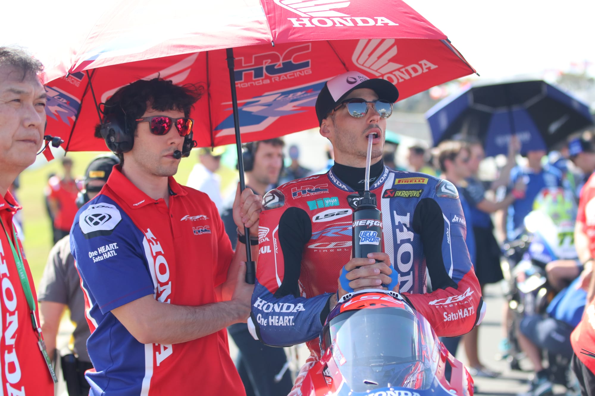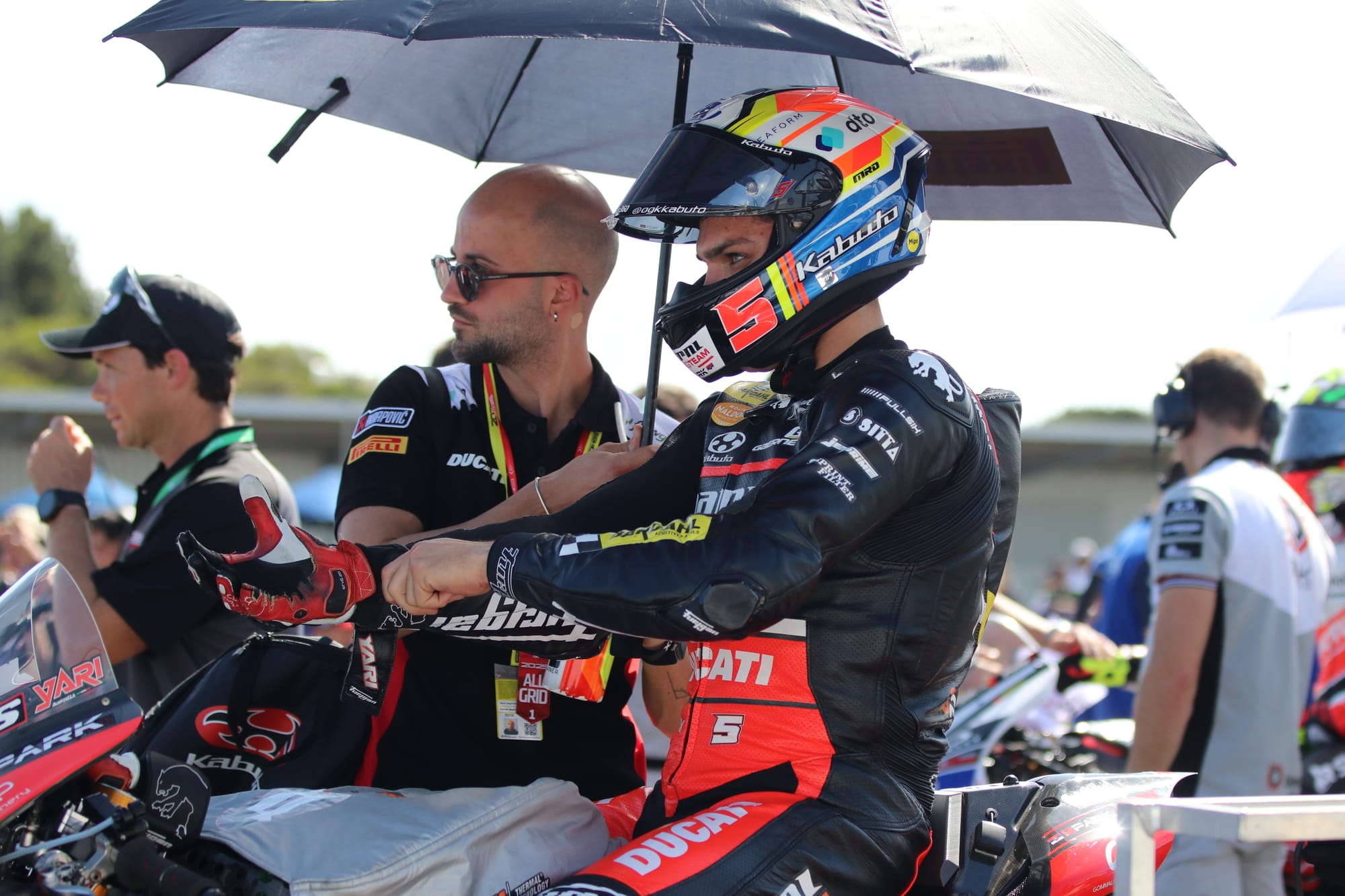 IT WAS a scorcher ahead of the WorldSBK Race 1 this afternoon at 4pm with riders attempting to keep cool in any way they could ahead of the race. From ice on the back of the neck to ice packs under the suit, fans blowing, umbrellas were up and water bottles were out for a race that Nicolo Bulega (Aruba.it Racing) led from start to finish.