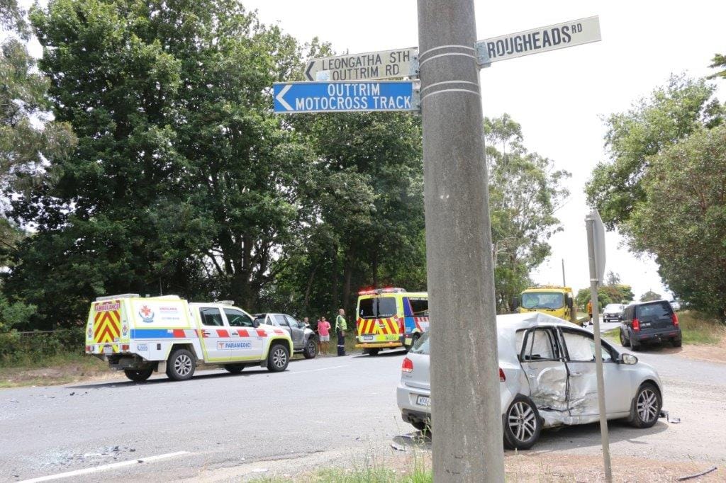 Police, ambulance and CFA were on the scene of a two-car collision involving a VW Golf and SUV sedan where it appears as if one of the cars was attempting to turn right at the corner of the Bass Highway and Leongatha South-Outtrim Road/Rougheads Road, outside the old Leongatha South School.
