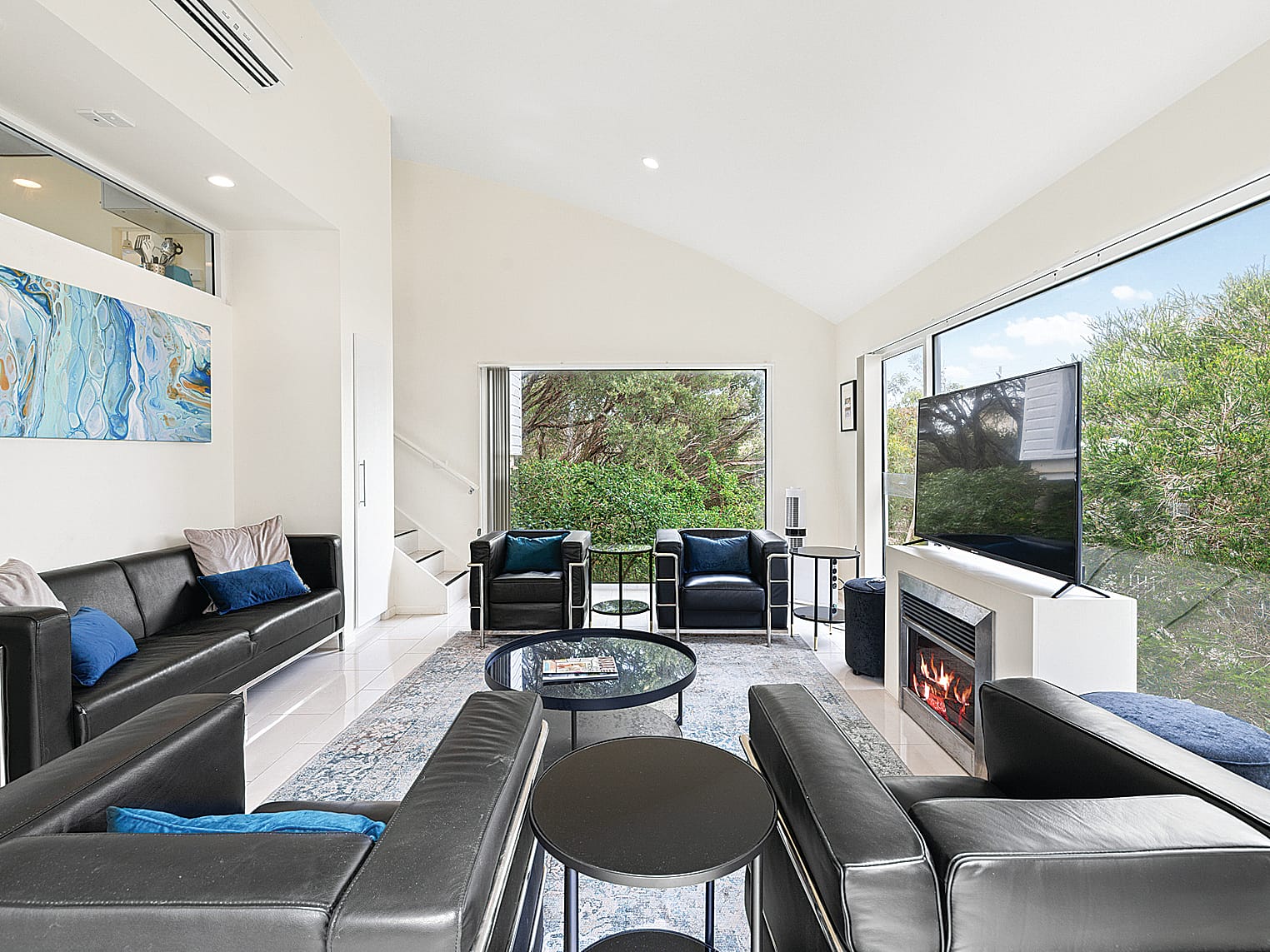 The living room is window walled on three sides, centred around a feature fireplace. The kitchen is a dream for entertainers and foodies alike, with Miele appliances and sleek contemporary styling. It flows into an open dining and family area, which extends onto a treetop-height entertaining deck, ideal for alfresco family dinners or a lazy morning coffee accompanied by birdsong.