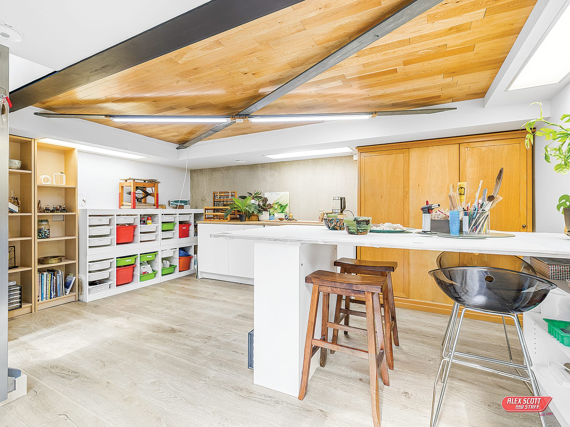Under the stairs, you’ll find cleverly hidden laundry facilities, and as you continue through this remarkable home, you’ll pass the striking entrance that welcomes every visitor with sophistication. Downstairs, an art studio and wine cooler await creative moments, while sliding doors open out to a serene courtyard where nature meets relaxation.