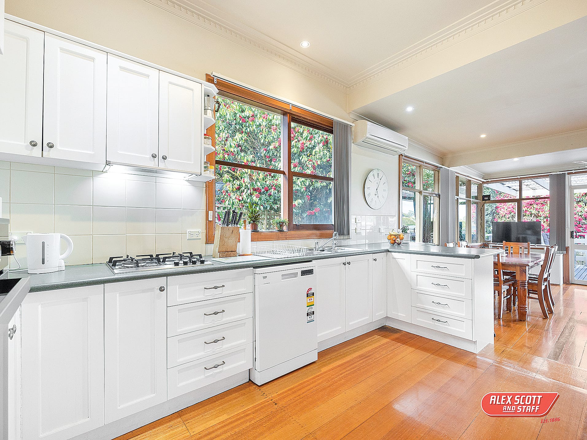 To the rear of the home is the kitchen and dining area with direct access to the back undercover deck. White cabinetry is showcased throughout the kitchen with stainless steel appliances, gas cooktop, dishwasher and breakfast bar.