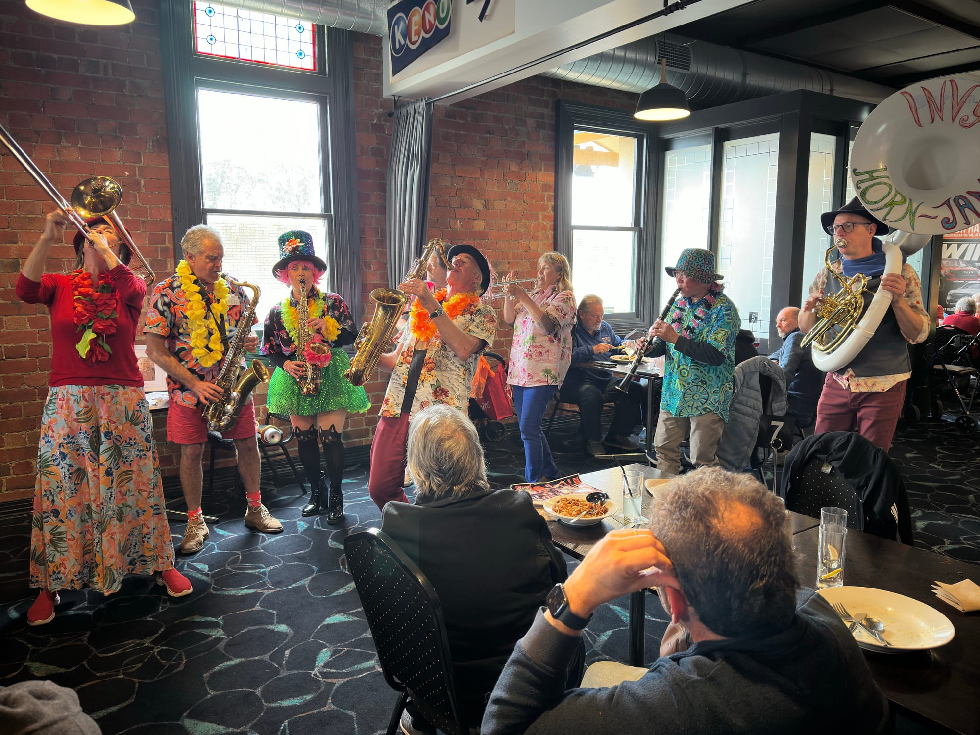 After having breakfast with her family, Ms. Tilley joined her large group of friends for lunch, cake and a spot of banter with a surprise and lively performance from the Invy Horn Jam.
