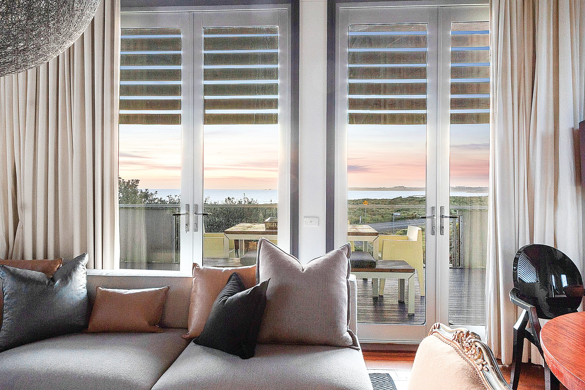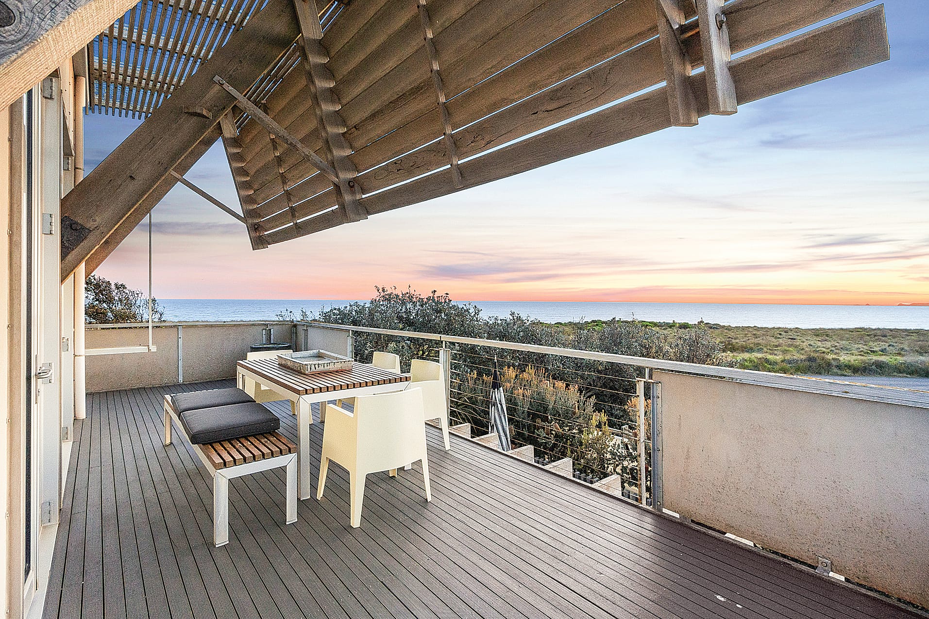 The main house was designed to take full advantage of the views; to open up and embrace summer living and close down and snuggle up for wild winters. Standing like a sentinel on guard, it sees everything from Cape Woolamai to Pyramid Rock and is a full three storeys high. With a spiral staircase that links the floors, it gathered the name the ‘Lighthouse’ by the local surfers.