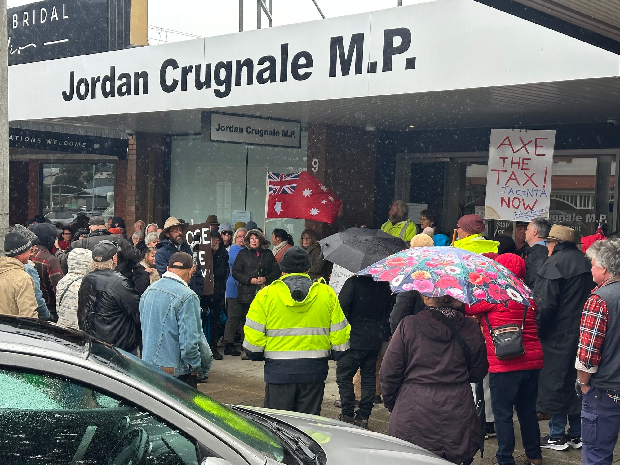 Axe the Tax! chant protestors outside Jordan Crugnales' office