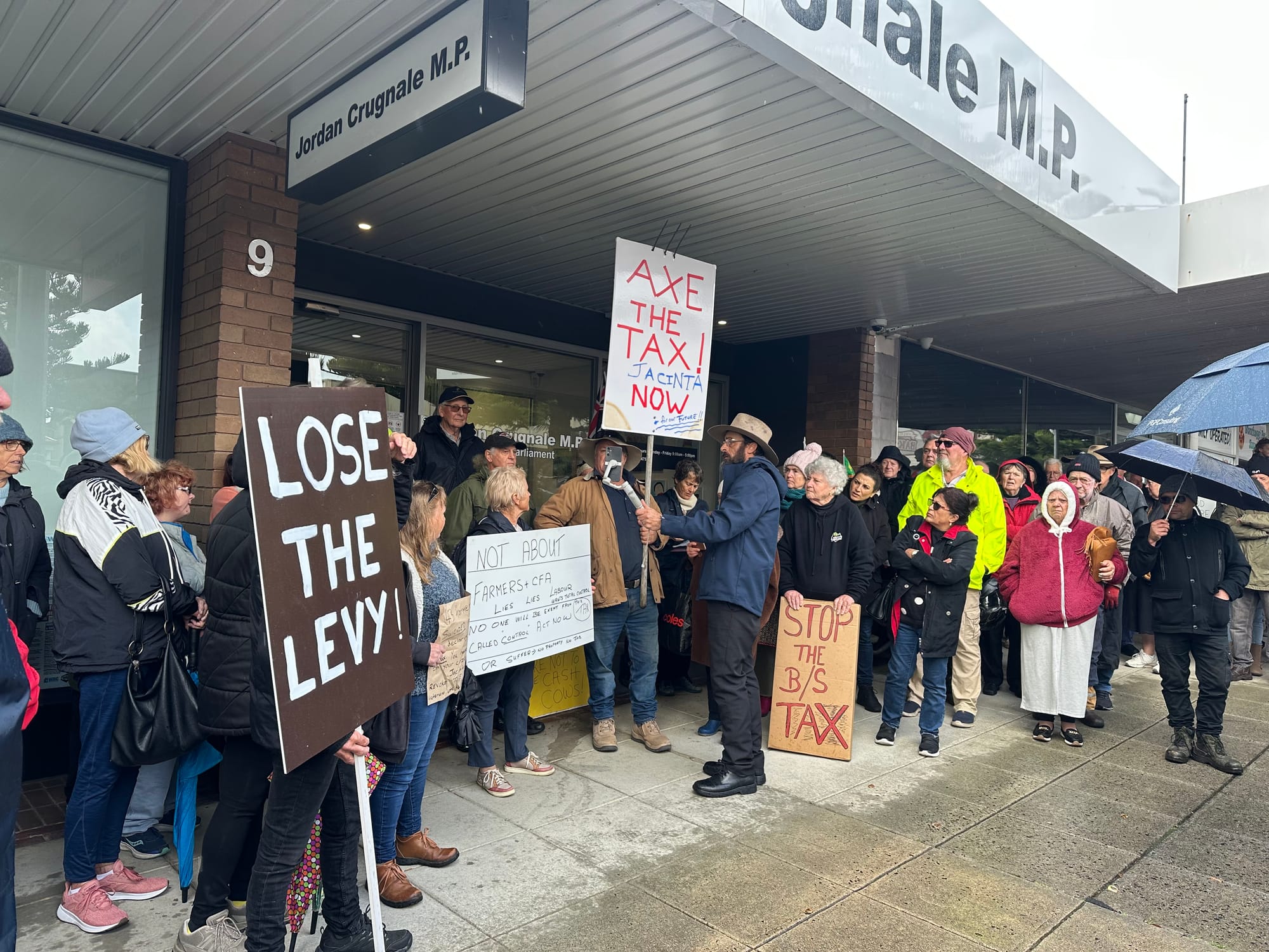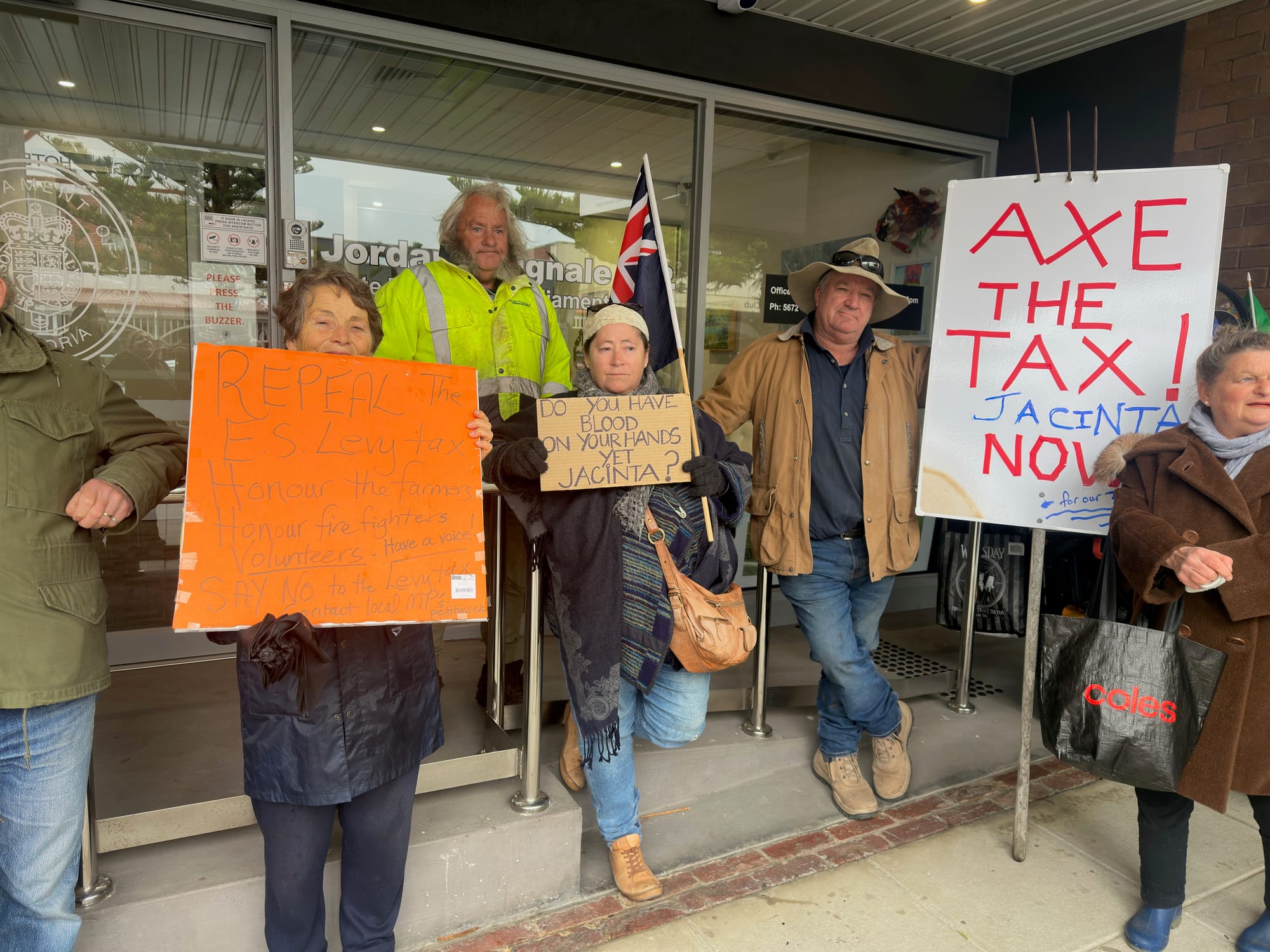 PROTSTORS gathered outside Member for Bass, Jordan Crugnale's office today with placards in hand and voices raised in unison against the State Governments recently passed emergency services and volunteers fund levy. Together the crowd chanted "Axe...
