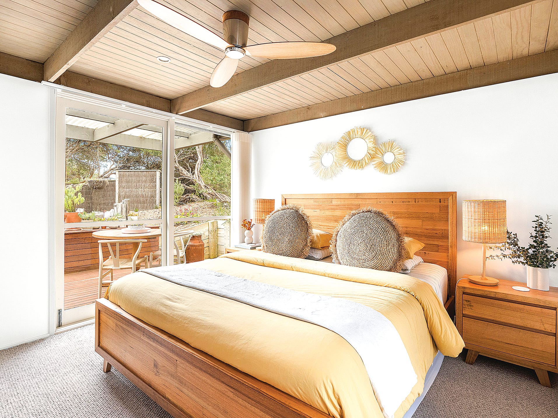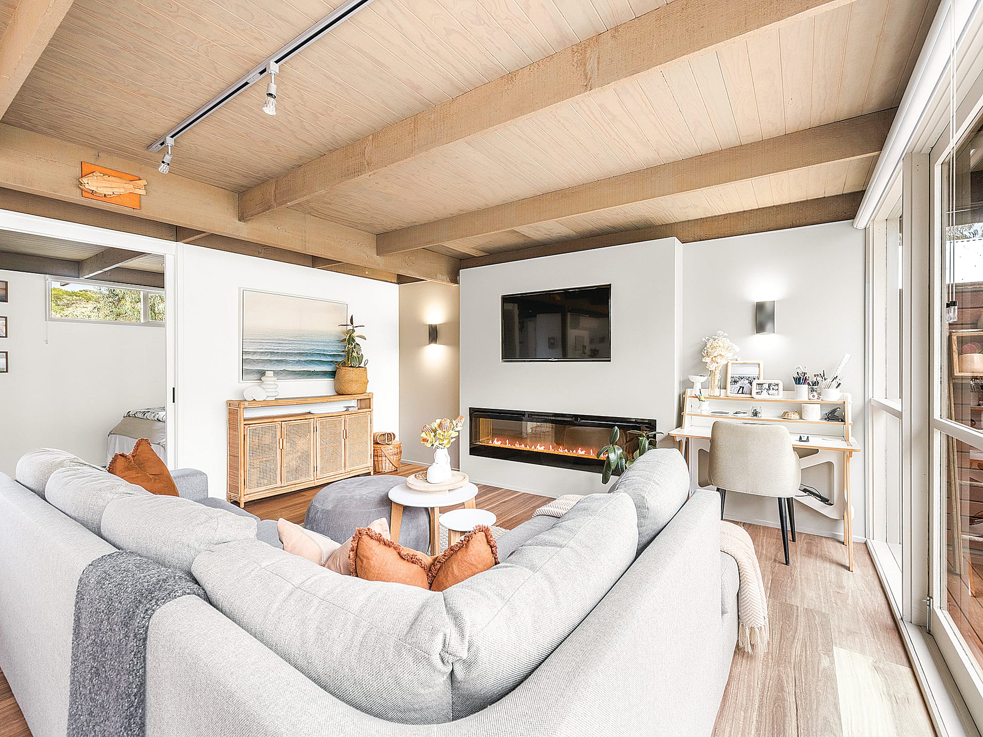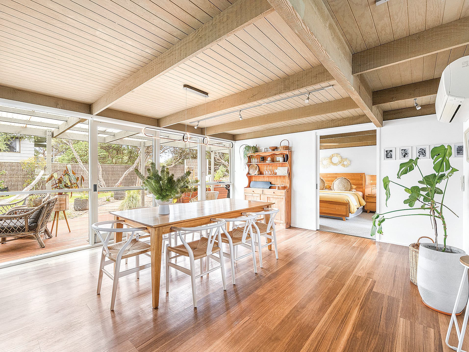 Step inside to a bright, airy interior defined by a neutral colour palette, extensive glazing, and a northern orientation that bathes the home in natural light. The open-plan living area seamlessly flows onto the outdoor entertaining space, while the kitchen boasts premium finishes such as Caesarstone countertops, Bosch appliances and earth-toned soft close cabinetry, perfectly paired with timber flooring and open shelving.