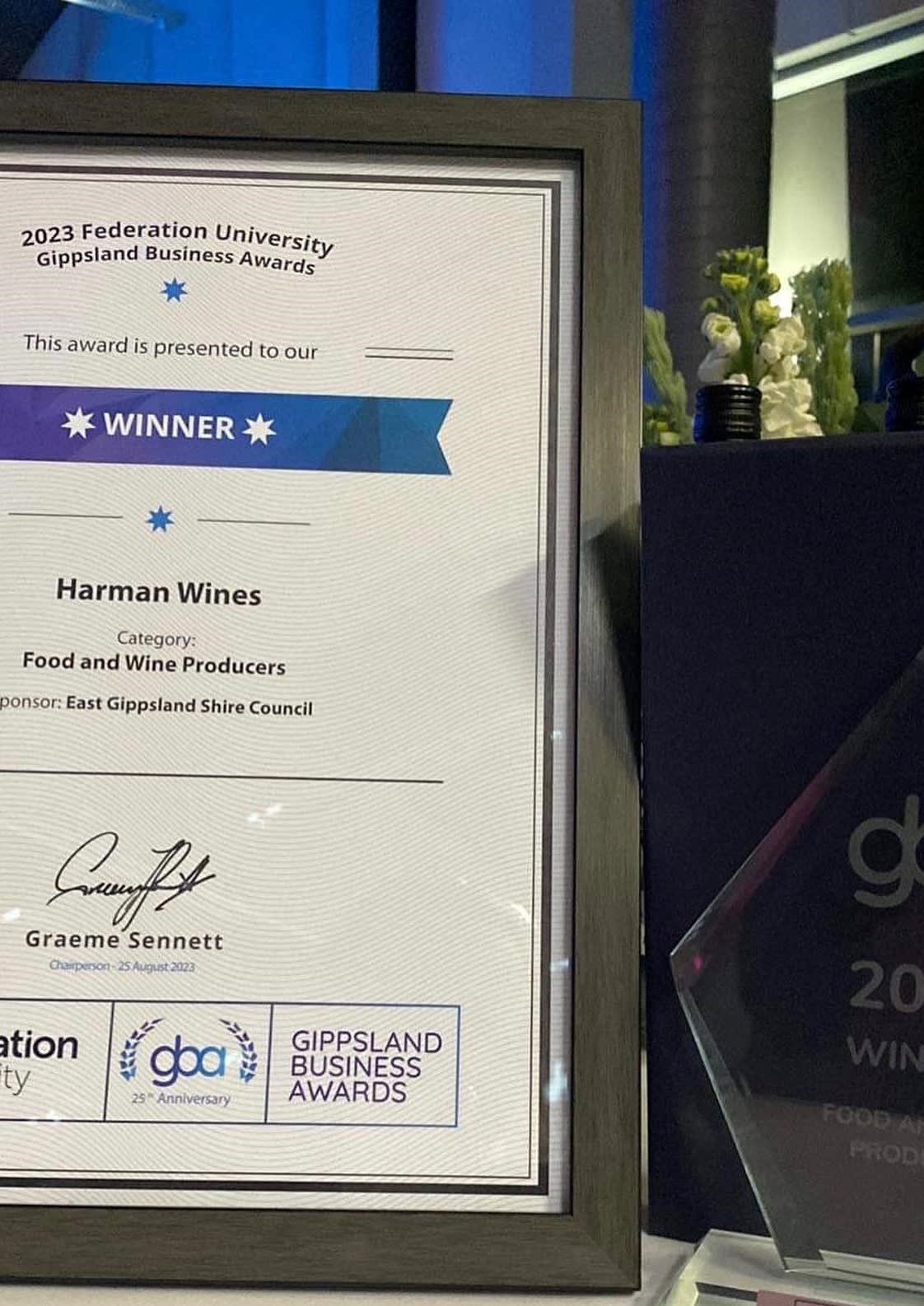 “So thrilled to have been announced the winner of the Food and Wine Producers award at the 2023 Gippsland Business Awards,” said David and Nicole Harman, owners and founders of Harman Wines.