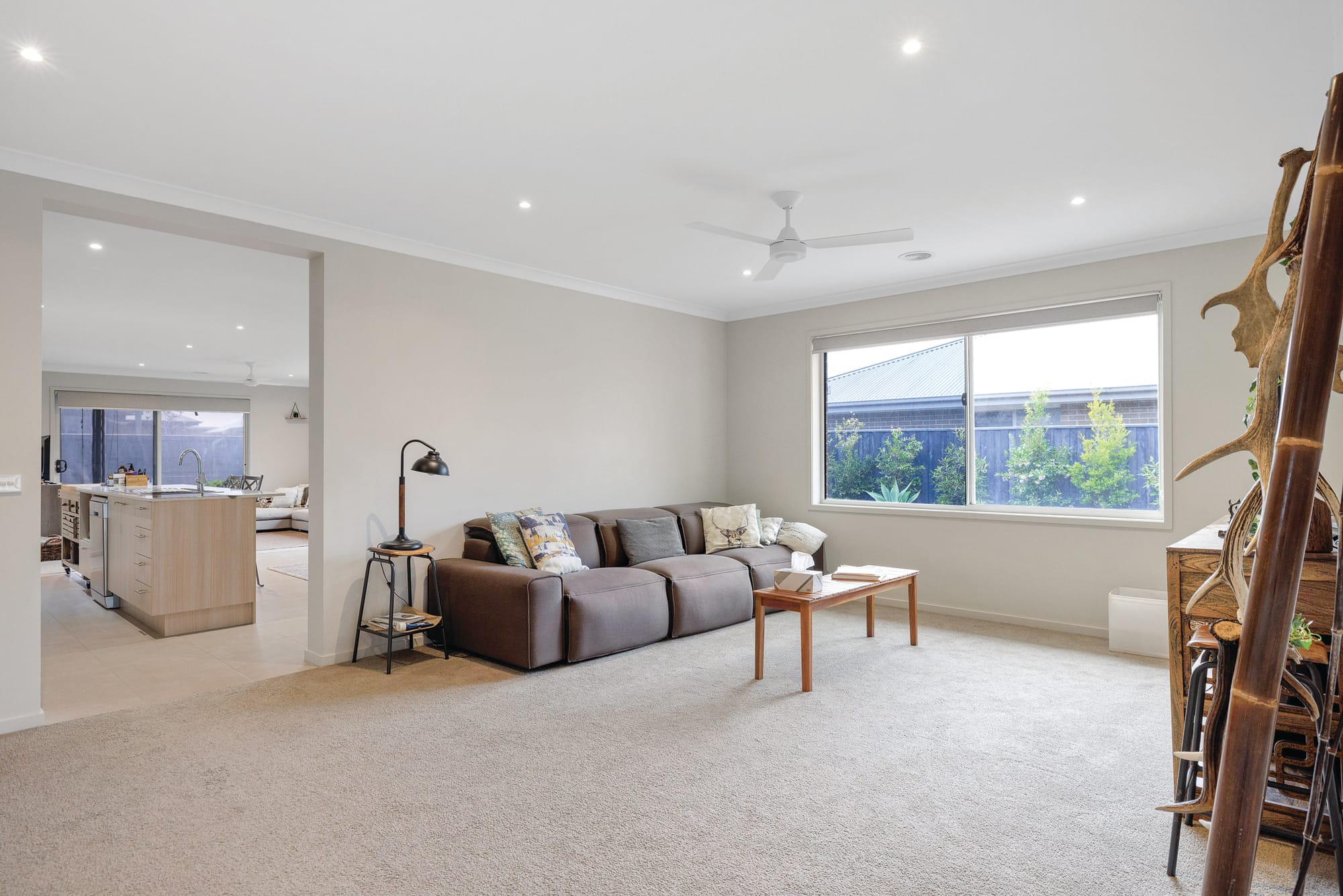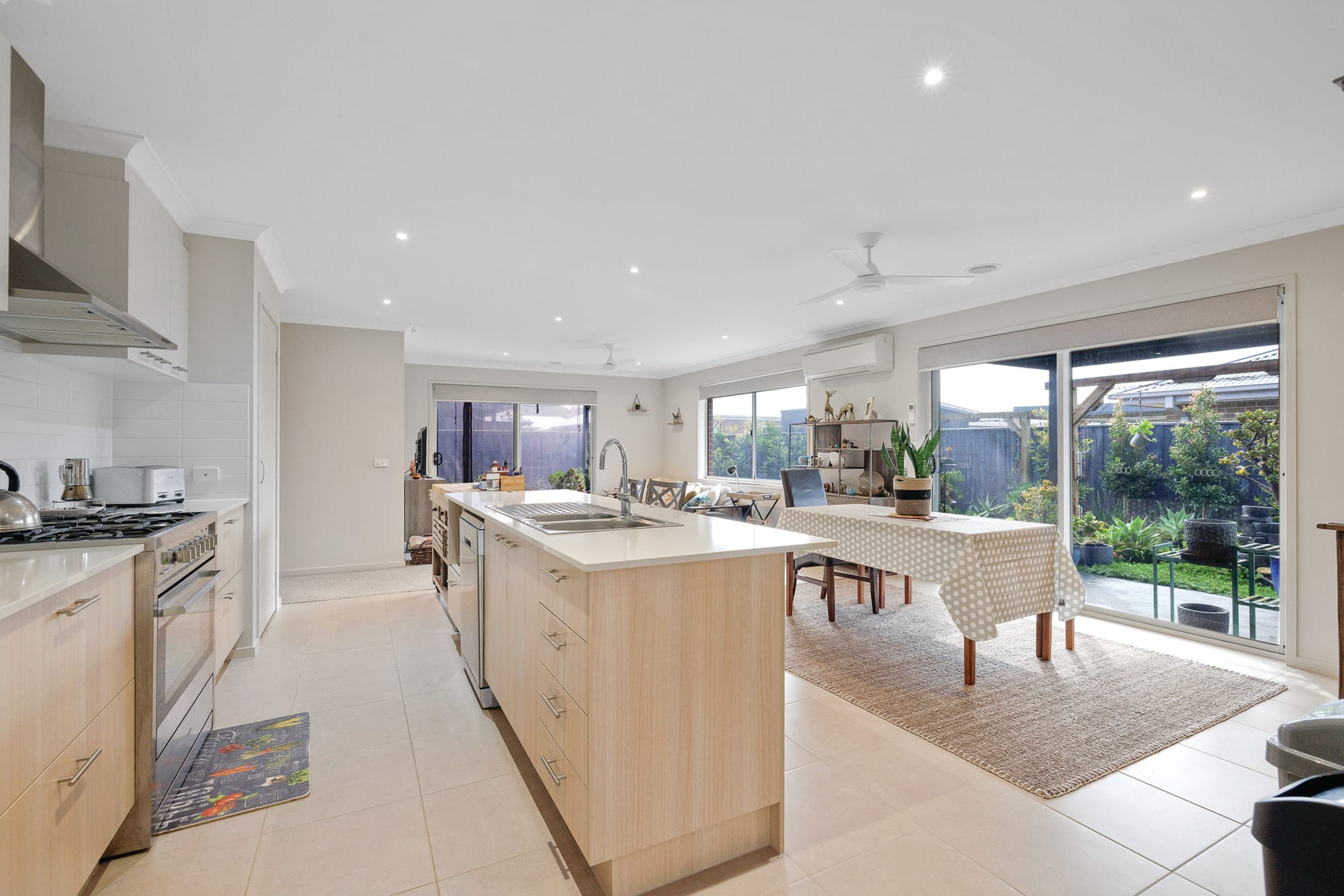 The large open plan family hub is ideal for entertaining with two access doors to outside, one leading to full width, pitched roof al fresco area with café blinds.