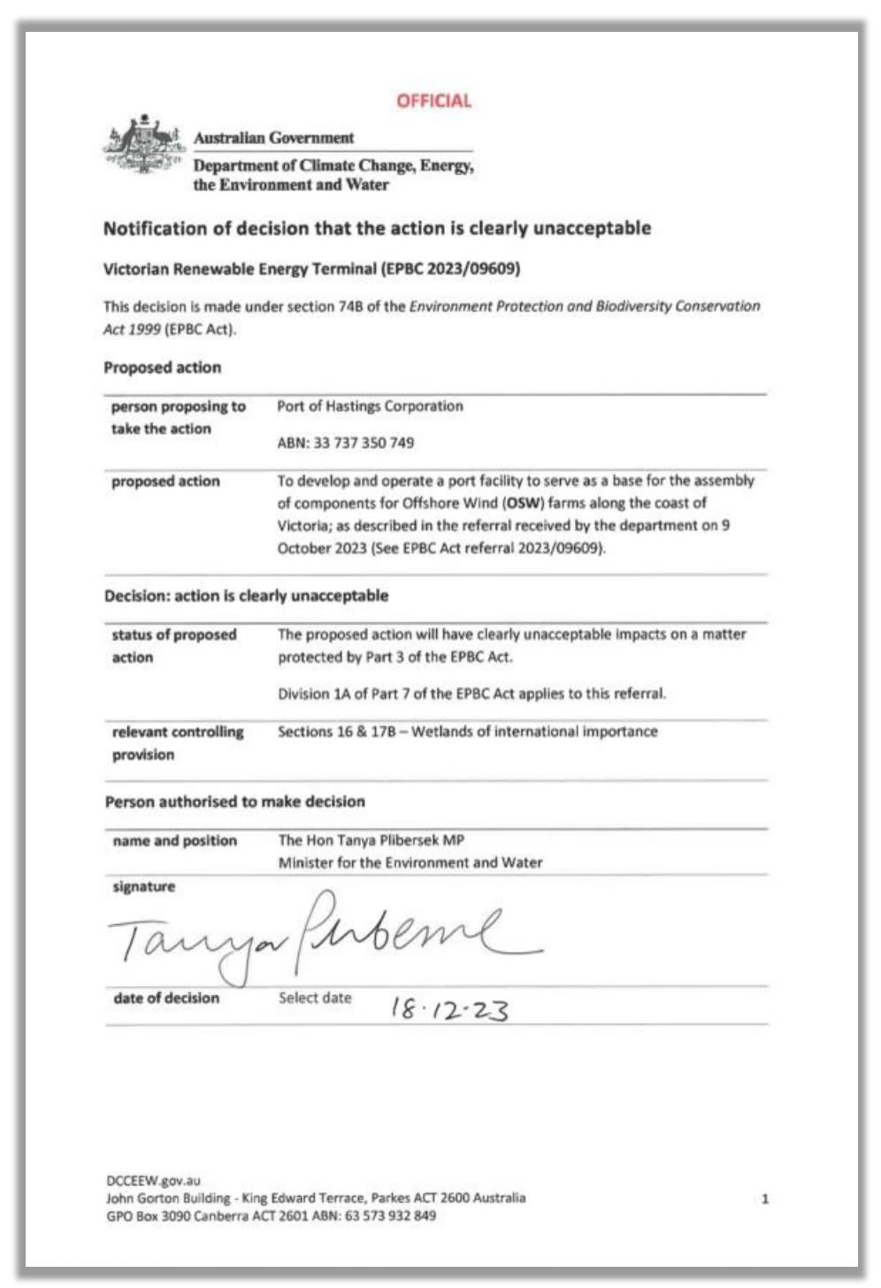 In a notice, signed by Minister Plibersek on December 18, 2023, it has been determined that: “The proposed action will have clearly unacceptable impacts on a matter protected by Part 3 of the EPBC Act (relevant controlling provision is Section 16 & 17B – Wetlands of international importance).”