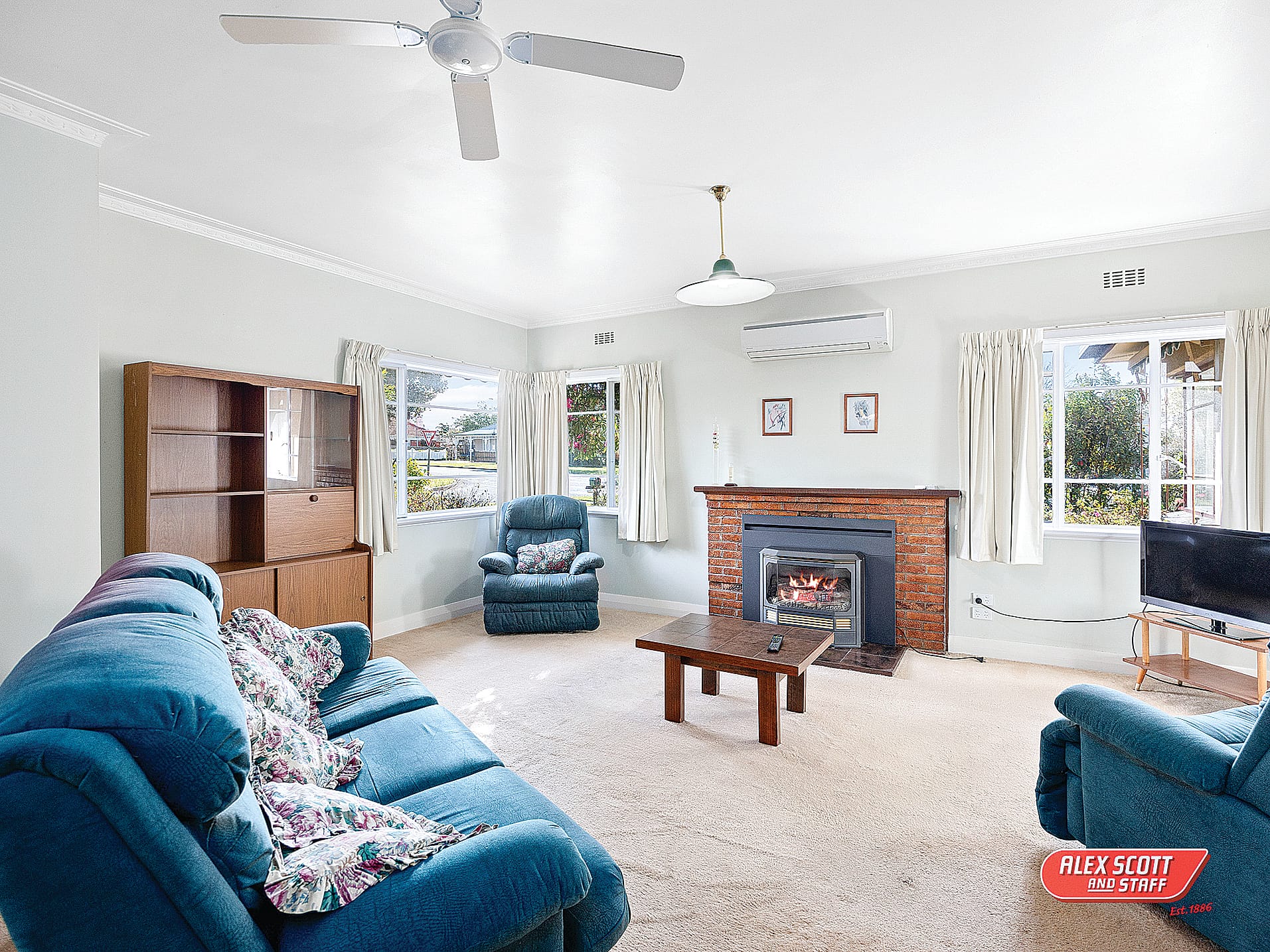 The kitchen features timber cabinetry and a great sized pantry with electric cooking. Moving through to the carpeted lounge room area, this space is serviced by a reverse cycle air conditioner, electric fireplace and ceiling fan.