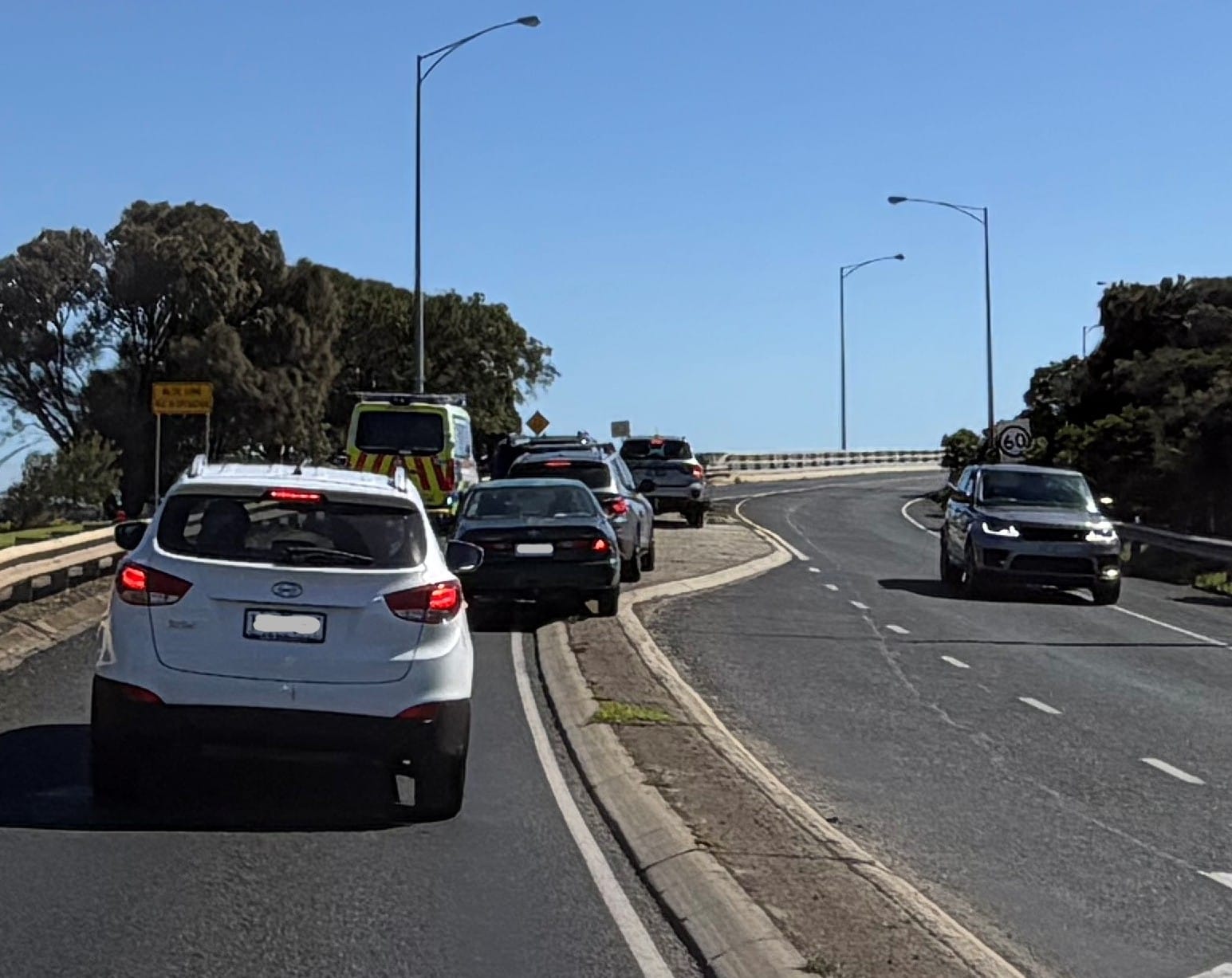 An unbroken stream of cars filled Phillip Island Road from the Bass Highway turnoff to the bridge and beyond at around 1.30pm making it especially challenging for the ambulance crew on an emergency call,