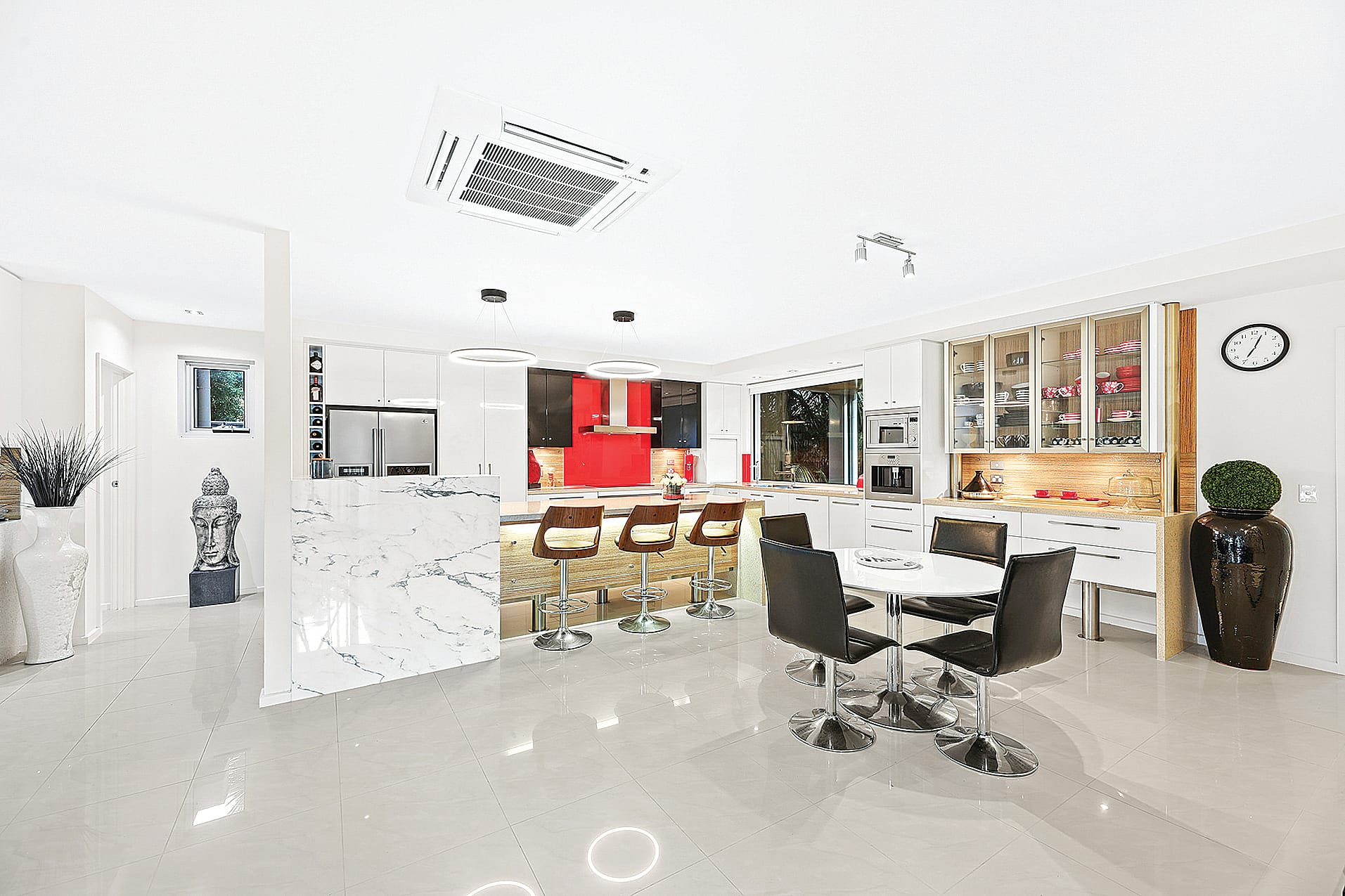 Crafted in a Queensland-inspired architectural style, this double-storey home, built approximately 13 years ago by a renowned local builder, invites an abundance of natural light through its large, double-glazed windows. The lower level unfolds as an open plan living and entertainment haven, featuring a high-end kitchen with a combination of marble and Caesarstone benchtops, Smeg appliances, a DeLonghi Built-in coffee machine, and more. The larger living zone, a cozy sitting room, and a meals area overlooking the pool, complete with a generous spirits bar and two built-in bar fridges, offer a perfect blend of sophistication and comfort. The enormous laundry, equipped with Caesarstone benchtops and ample storage, conveniently provides direct access to the oversize double car garage. A well-appointed bathroom caters to those returning from a refreshing swim in the inground salt-chlorinated, self-cleaning, solar-heated swimming pool, surrounded by a landscaped and private north-facing front.