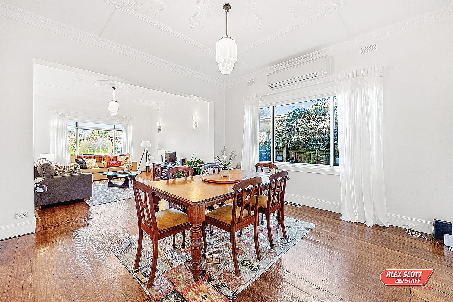 From the hallway you are welcomed into the living/ dining space which is serviced by a reverse cycle air conditioner and features ornate cornice, large ceiling roses with pendant lighting, decorative skirting boards and architraves which flow through the rest of the home.
