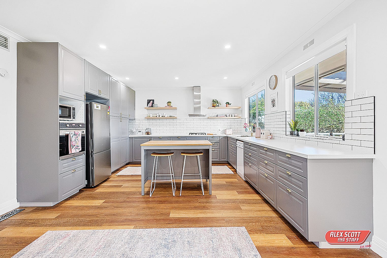 The brand-new large kitchen is a real standout, highlighting soft close grey cabinetry with gold handles, white subway tiles as the backsplash, timber floating shelves either side of the rangehood, wall oven with microwave slot above, gas cooktop, dishwasher and ample cupboard space with the bonus of a large walk-in pantry.