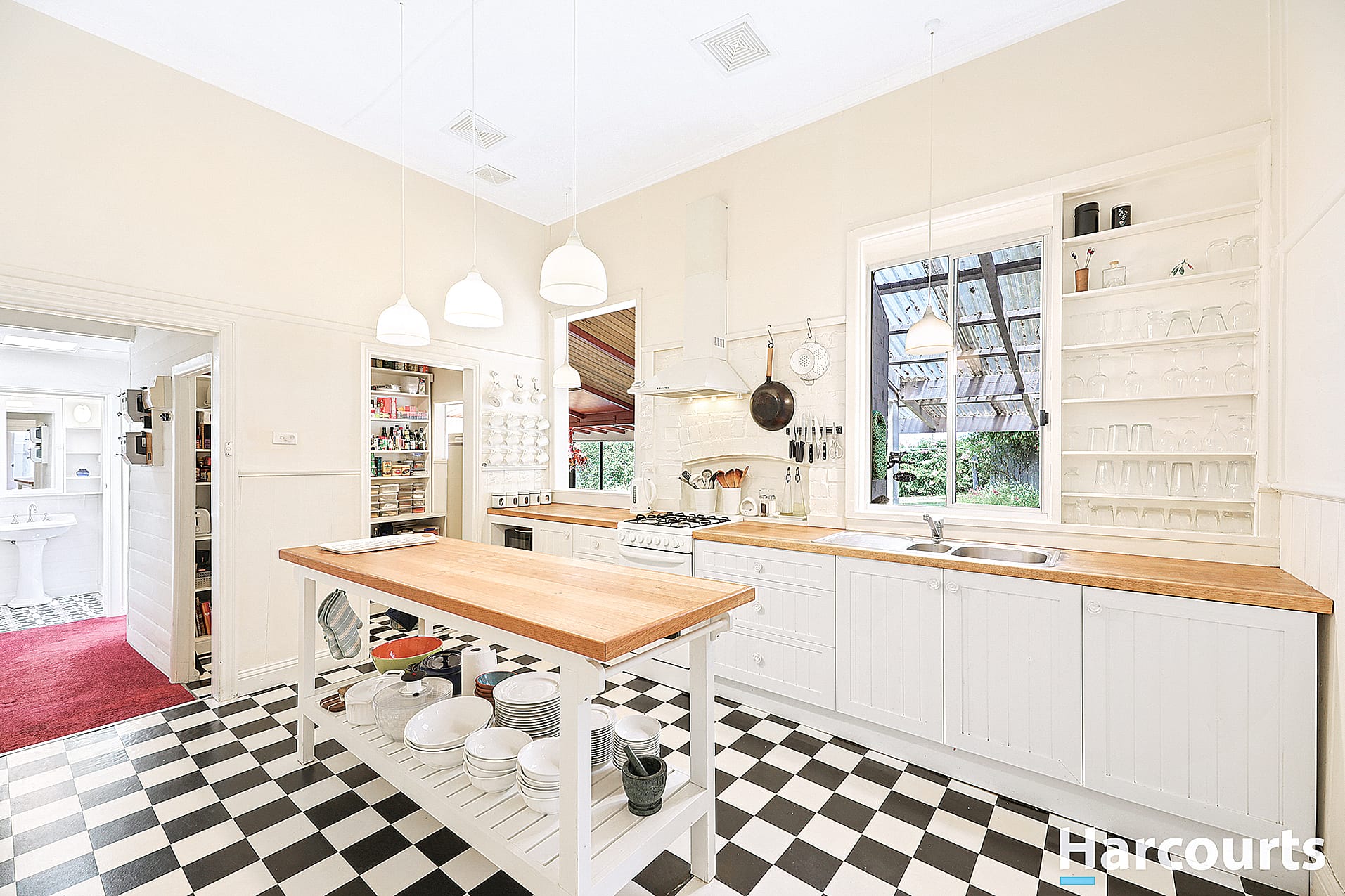 Country-Style Kitchen: Prepare meals in the heart of the home, where a charming country-style kitchen awaits. Adorned with black and white checkered vinyl flooring, timber benchtops, and a gas upright stove, this kitchen is as functional as it is inviting. An open pantry adds convenience, ensuring everything you need is within reach.