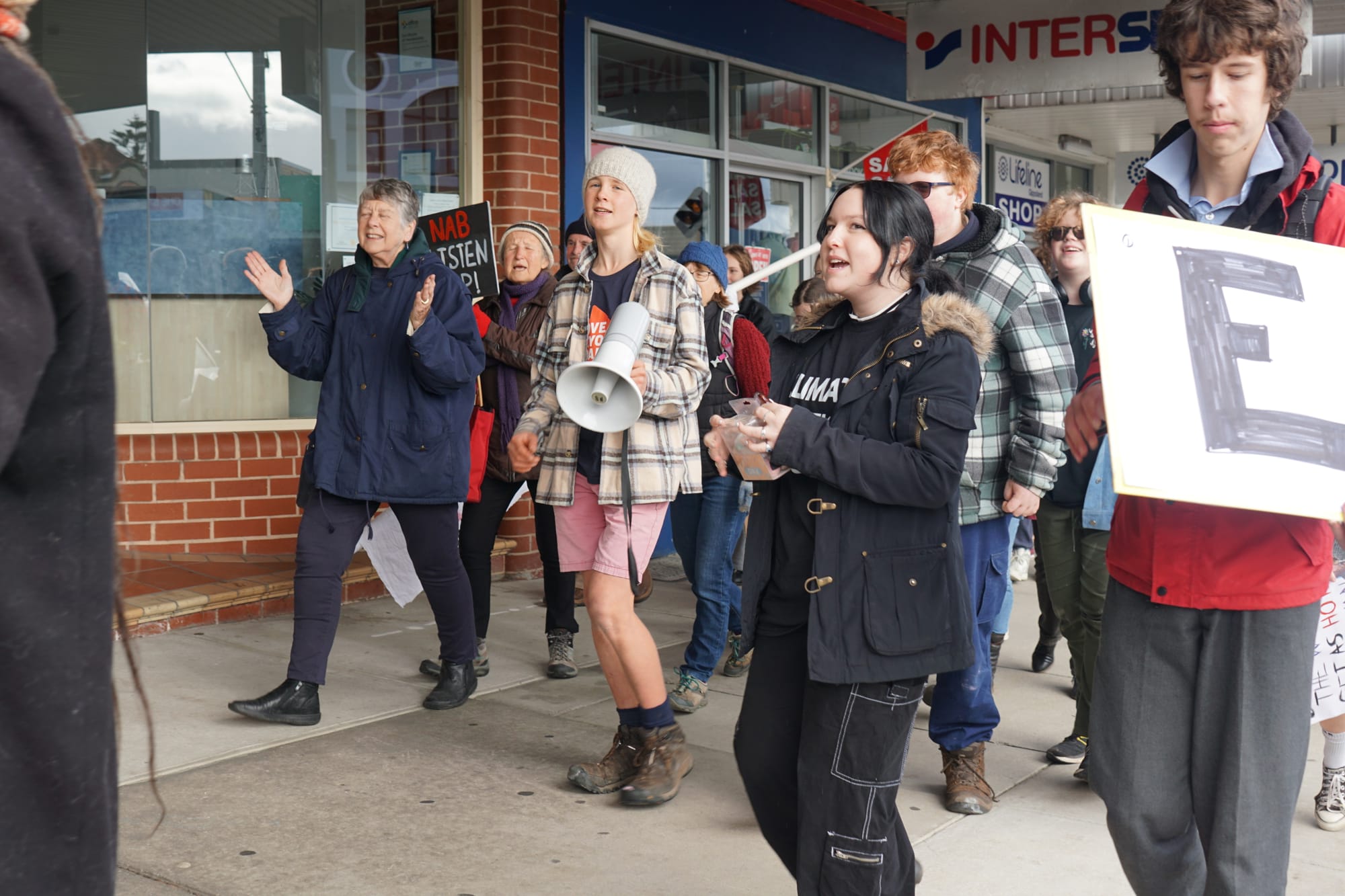 More than 30 protesters including school students passionately but peacefully marched throughout the town chanting their slogans and chatting to locals about the issues they're raising.