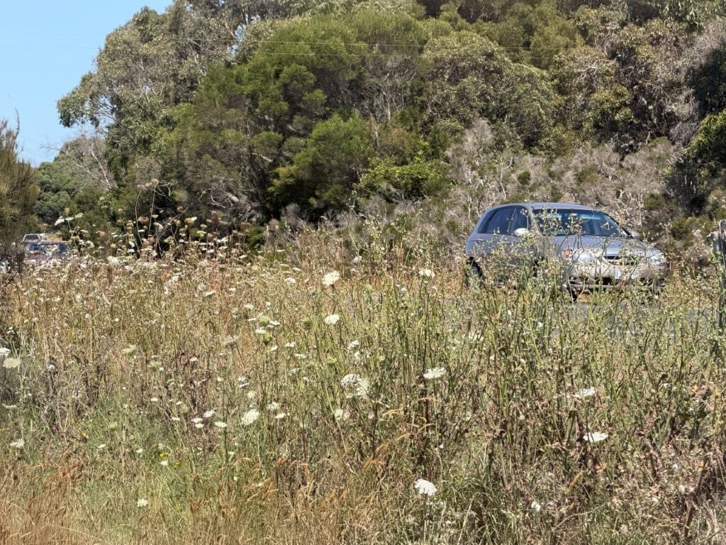 You can barely see the ‘Parks Victoria’ sign for the overgrowth which blends into the long, rank grass on the roadside.
