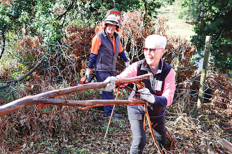 Loch Sport’s Gordon Arnel and Iain Batten of the Gold Coast were busy with their chainsaws during Tuesday’s visit, with other BlazeAid volunteers helping in the clearing operation.